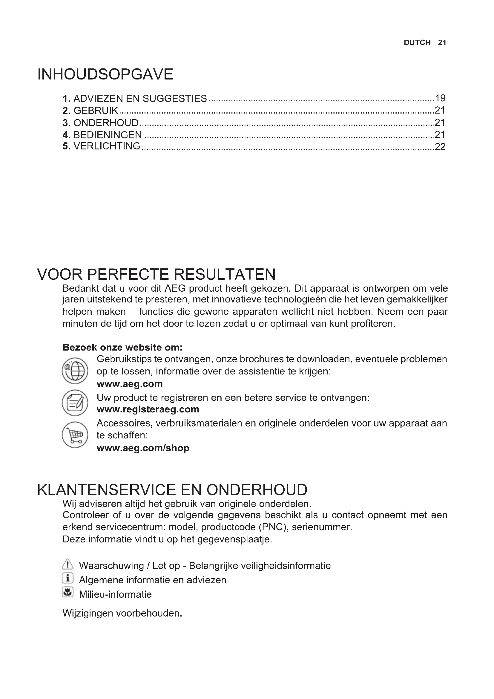 Bedankt dat u voor dit AEG product heeft gekozen. Dit apparaat is ontworpen om vele jaren uitstekend te presteren, met innovatieve technologieën die het leven gemakkelijker helpen maken – functies die gewone apparaten wellicht niet hebben. Neem een paar minuten de tijd om het door te lezen zodat u er optimaal van kunt proteren. Bezoek onze website om: Gebruikstips te ontvangen, onze brochures te downloaden, eventuele problemen op te lossen, informatie over de assistentie te krijgen: www.aeg.com Uw product te registreren en een betere service te ontvangen: www.registeraeg.com Accessoires, verbruiksmaterialen en originele onderdelen voor uw apparaat aan te schaffen: www.aeg.com/shop