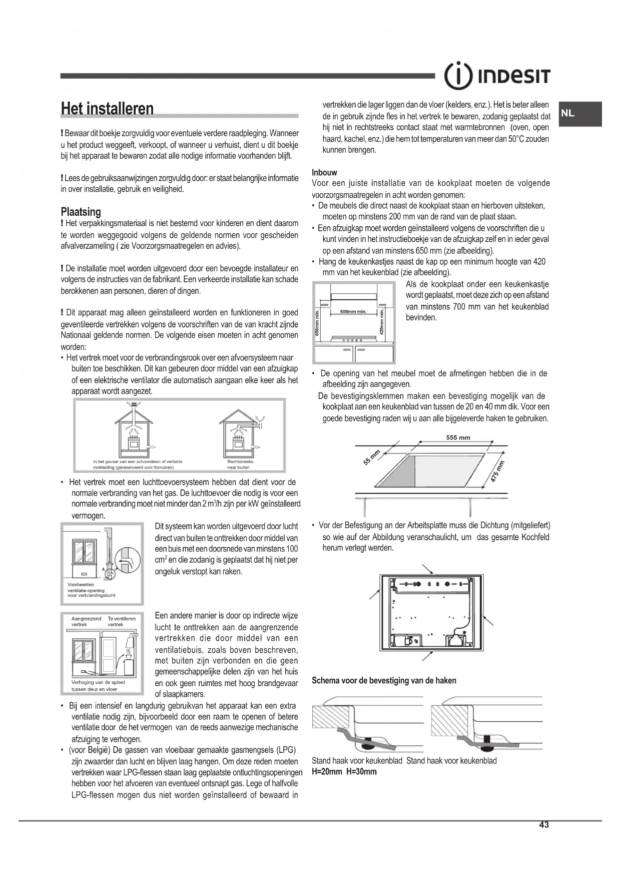 Het installeren ! Bewaar dit boekje zorgvuldig voor eventuele verdere raadpleging. Wanneer u het product weggeeft, verkoopt, of wanneer u verhuist, dient u dit boekje bij het apparaat te bewaren zodat alle nodige informatie voorhanden blijft. ! Lees de gebruiksaanwijzingen zorgvuldig door: er staat belangrijke informatie in over installatie, gebruik en veiligheid. Plaatsing ! Het verpakkingsmateriaal is niet bestemd voor kinderen en dient daarom te worden weggegooid volgens de geldende normen voor gescheiden afvalverzameling ( zie Voorzorgsmaatregelen en advies). ! De installatie moet worden uitgevoerd door een bevoegde installateur en volgens de instructies van de fabrikant. Een verkeerde installatie kan schade berokkenen aan personen, dieren of dingen. ! Dit apparaat mag alleen geïnstalleerd worden en funktioneren in goed geventileerde vertrekken volgens de voorschriften van de van kracht zijnde Nationaal geldende normen. De volgende eisen moeten in acht genomen worden:
