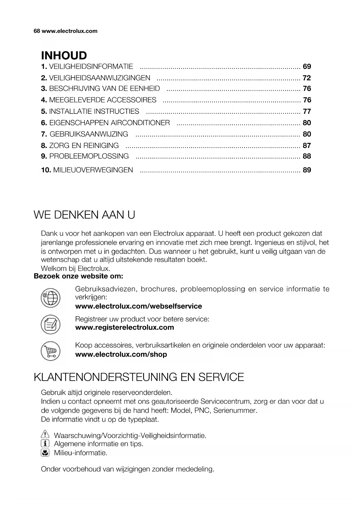 Dank u voor het aankopen van een Electrolux apparaat. U heeft een product gekozen dat jarenlange professionele ervaring en innovatie met zich mee brengt. Ingenieus en stijlvol, het is ontworpen met u in gedachten. Dus wanneer u het gebruikt, kunt u veilig uitgaan van de wetenschap dat u altijd uitstekende resultaten boekt. Welkom bij Electrolux. Gebruik altijd originele reserveonderdelen. Indien u contact opneemt met ons geautoriseerde Servicecentrum, zorg er dan voor dat u de volgende gegevens bij de hand heeft: Model, PNC, Serienummer. De informatie vindt u op de typeplaat. Onder voorbehoud van wijzigingen zonder mededeling. Waarschuwing/Voorzichtig-Veiligheidsinformatie. Algemene informatie en tips. Milieu-informatie. Gebruiksadviezen, brochures, probleemoplossing en service informatie te verkrijgen: www.electrolux.com/webselfservice Bezoek onze website om: Registreer uw product voor betere service: www.registerelectrolux.com Koop accessoires, verbruiksartikelen en originele onderdelen voor uw apparaat: www.electrolux.com/shop INHOUD