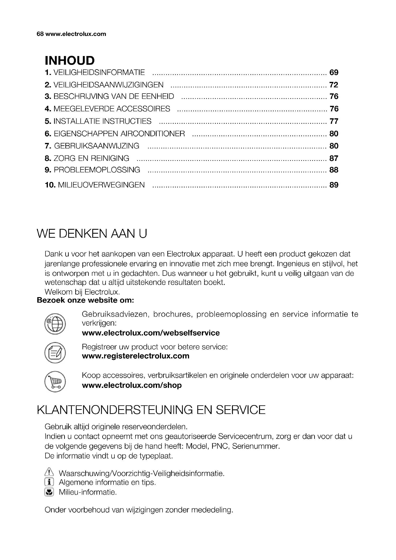 Dank u voor het aankopen van een Electrolux apparaat. U heeft een product gekozen dat jarenlange professionele ervaring en innovatie met zich mee brengt. Ingenieus en stijlvol, het is ontworpen met u in gedachten. Dus wanneer u het gebruikt, kunt u veilig uitgaan van de wetenschap dat u altijd uitstekende resultaten boekt. Welkom bij Electrolux. Gebruik altijd originele reserveonderdelen. Indien u contact opneemt met ons geautoriseerde Servicecentrum, zorg er dan voor dat u de volgende gegevens bij de hand heeft: Model, PNC, Serienummer. De informatie vindt u op de typeplaat. Onder voorbehoud van wijzigingen zonder mededeling. Waarschuwing/Voorzichtig-Veiligheidsinformatie. Algemene informatie en tips. Milieu-informatie. Gebruiksadviezen, brochures, probleemoplossing en service informatie te verkrijgen: www.electrolux.com/webselfservice Bezoek onze website om: Registreer uw product voor betere service: www.registerelectrolux.com Koop accessoires, verbruiksartikelen en originele onderdelen voor uw apparaat: www.electrolux.com/shop INHOUD