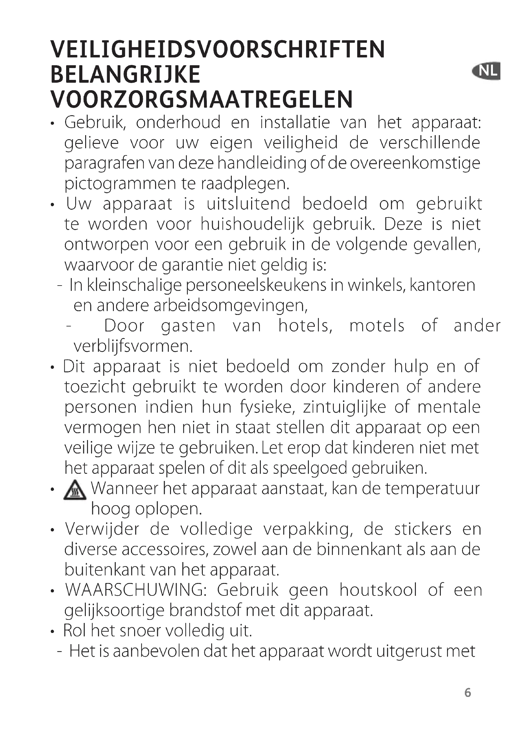 - Rol het snoer volledig uit. - Het is aanbevolen dat het apparaat wordt uitgerust met7 een differentieelschakelaar met een uitschakelstroom van maximum 30 mA. - Steek de stekker van het apparaat altijd in een geaard stopcontact (voor klasse I apparatuur). - Het is aanbevolen om het snoer regelmatig op schade te controleren. Gebruik het apparaat niet als schade aan het snoer wordt waargenomen.