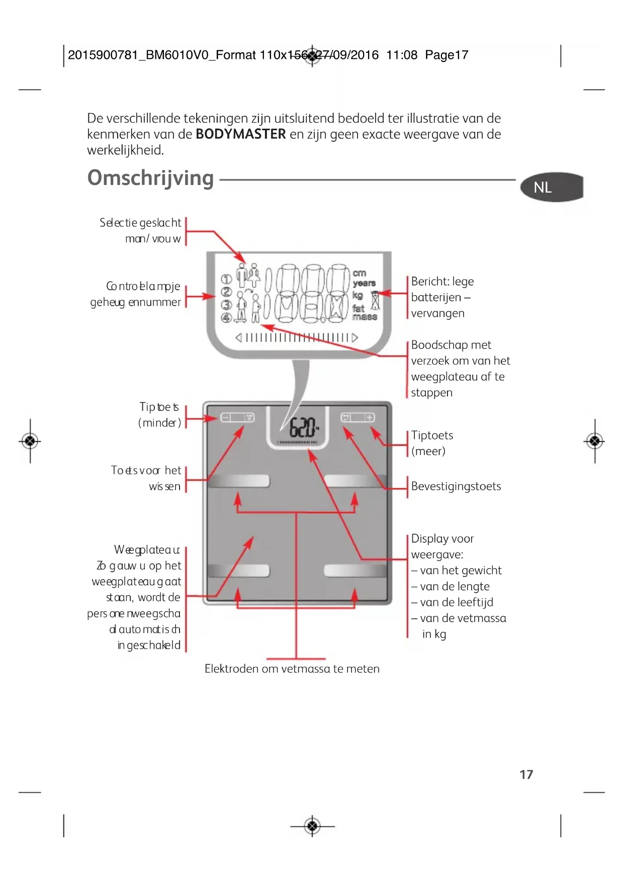 2015900781_BM6010V0_Format 110x156 27/09/2016 11:08 Page161717 De verschillende tekeningen zijn uitsluitend bedoeld ter illustratie van de kenmerken van de BODYMASTER en zijn geen exacte weergave van de werkelijkheid. Omschrijving