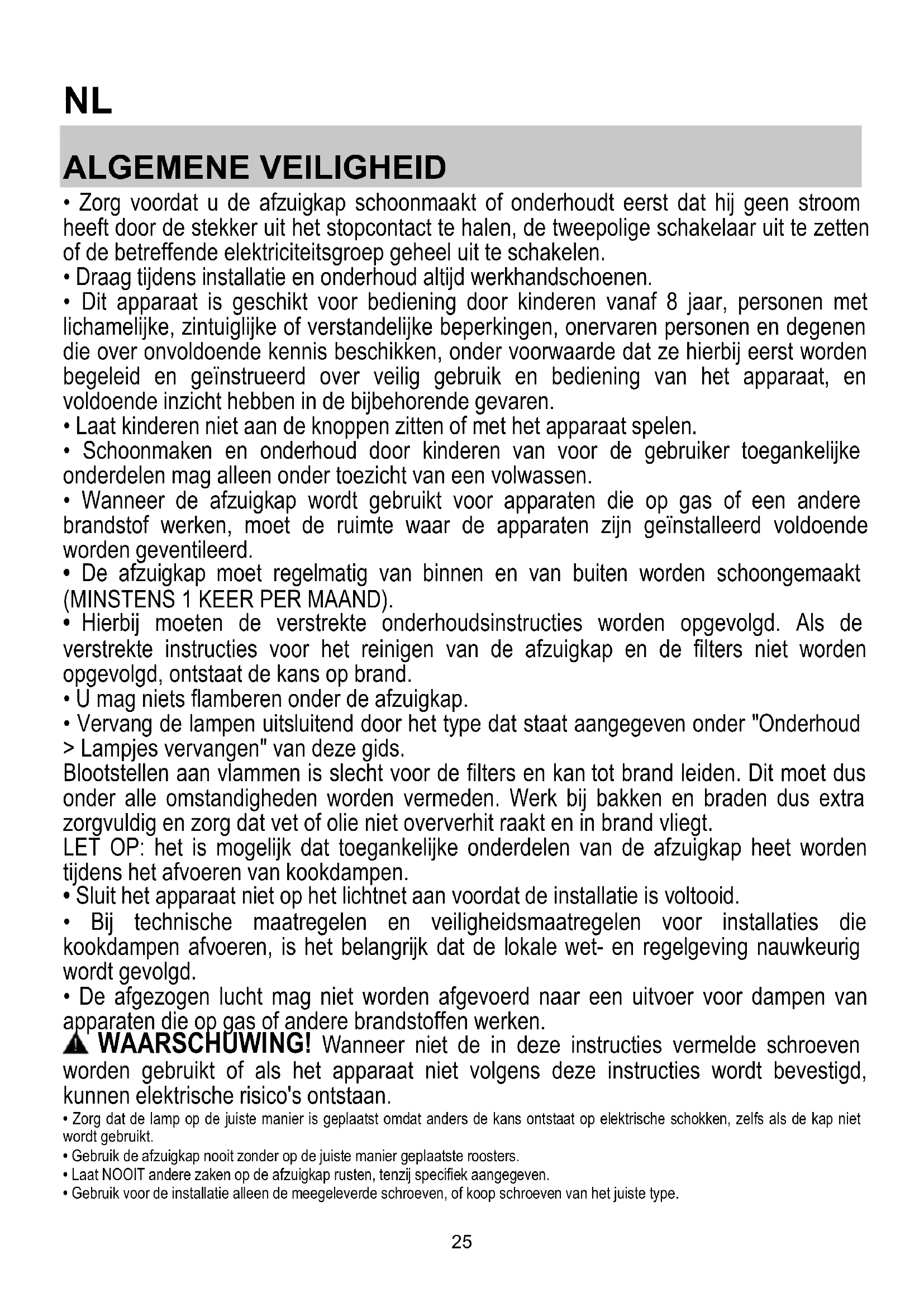 - Laat NOOIT andere zaken op de afzuigkap rusten, tenzij specifiek aangegeven.