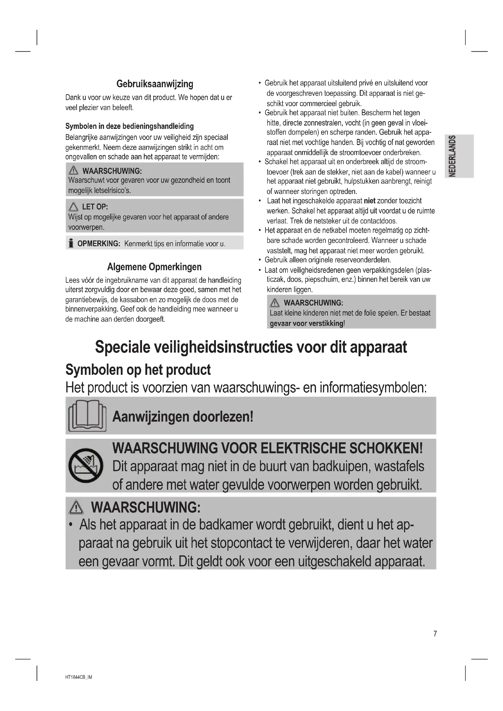 - Als het apparaat in de badkamer wordt gebruikt, dient u het ap- paraat na gebruik uit het stopcontact te verwijderen, daar het water een gevaar vormt. Dit geldt ook voor een uitgeschakeld apparaat.8 HT1844CB_IM 28.01.16 WAARSCHUWING: