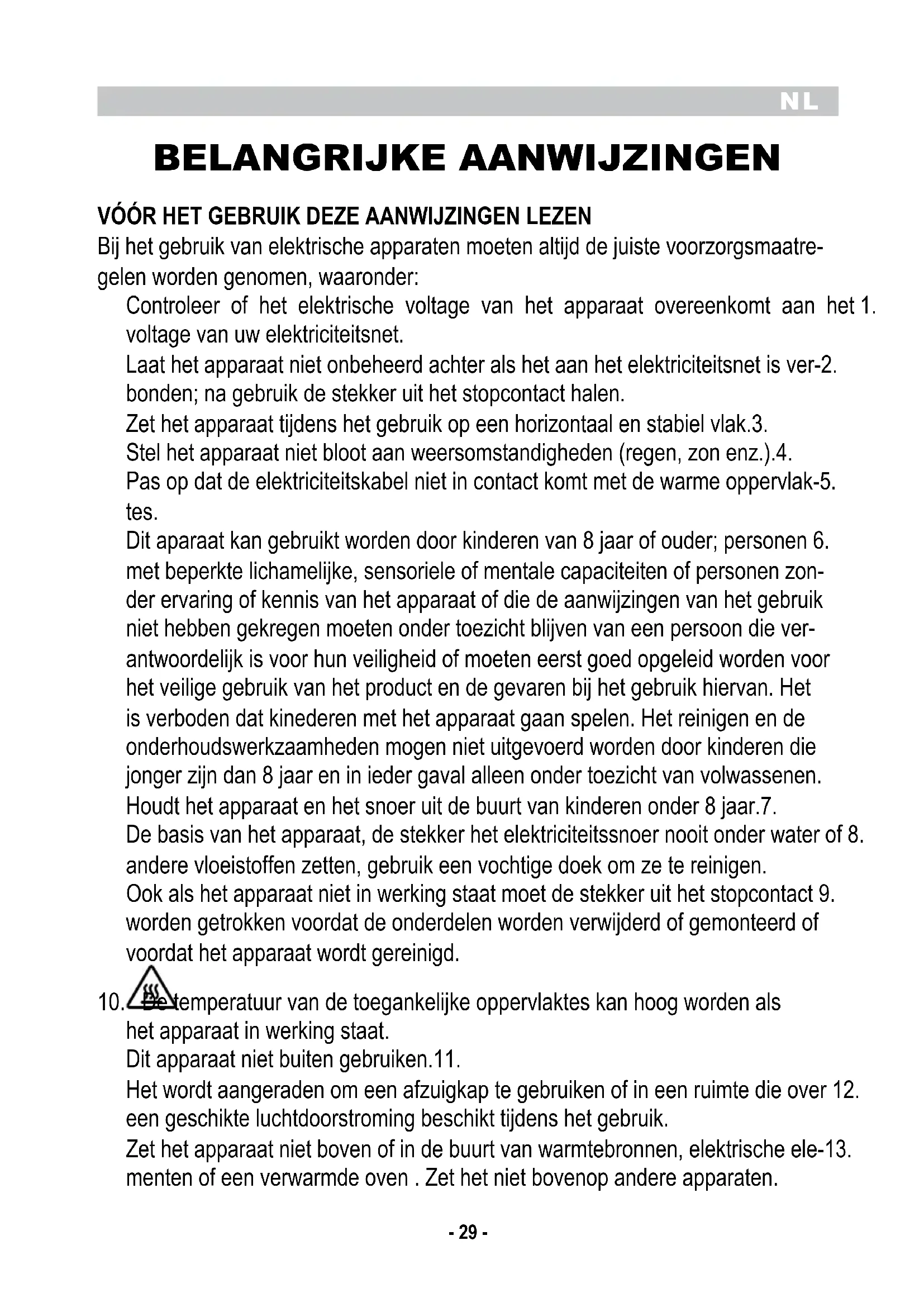 BELANGRIJKE AANWIJZINGEN VÓÓR HET GEBRUIK DEZE AANWIJZINGEN LEZEN Bij het gebruik van elektrische apparaten moeten altijd de juiste voorzorgsmaatre- gelen worden genomen, waaronder: Controleer of het elektrische voltage van het apparaat overeenkomt aan het 1. voltage van uw elektriciteitsnet. Laat het apparaat niet onbeheerd achter als het aan het elektriciteitsnet is ver-2. bonden; na gebruik de stekker uit het stopcontact halen. Zet het apparaat tijdens het gebruik op een horizontaal en stabiel vlak.3. Stel het apparaat niet bloot aan weersomstandigheden (regen, zon enz.).4. Pas op dat de elektriciteitskabel niet in contact komt met de warme oppervlak-5. tes. Dit aparaat kan gebruikt worden door kinderen van 8 jaar of ouder; personen 6. met beperkte lichamelijke, sensoriele of mentale capaciteiten of personen zon- der ervaring of kennis van het apparaat of die de aanwijzingen van het gebruik niet hebben gekregen moeten onder toezicht blijven van een persoon die ver- antwoordelijk is voor hun veiligheid of moeten eerst goed opgeleid worden voor het veilige gebruik van het product en de gevaren bij het gebruik hiervan. Het is verboden dat kinederen met het apparaat gaan spelen. Het reinigen en de onderhoudswerkzaamheden mogen niet uitgevoerd worden door kinderen die jonger zijn dan 8 jaar en in ieder gaval alleen onder toezicht van volwassenen. Houdt het apparaat en het snoer uit de buurt van kinderen onder 8 jaar.7. De basis van het apparaat, de stekker het elektriciteitssnoer nooit onder water of 8. andere vloeistoffen zetten, gebruik een vochtige doek om ze te reinigen. Ook als het apparaat niet in werking staat moet de stekker uit het stopcontact 9. worden getrokken voordat de onderdelen worden verwijderd of gemonteerd of voordat het apparaat wordt gereinigd.