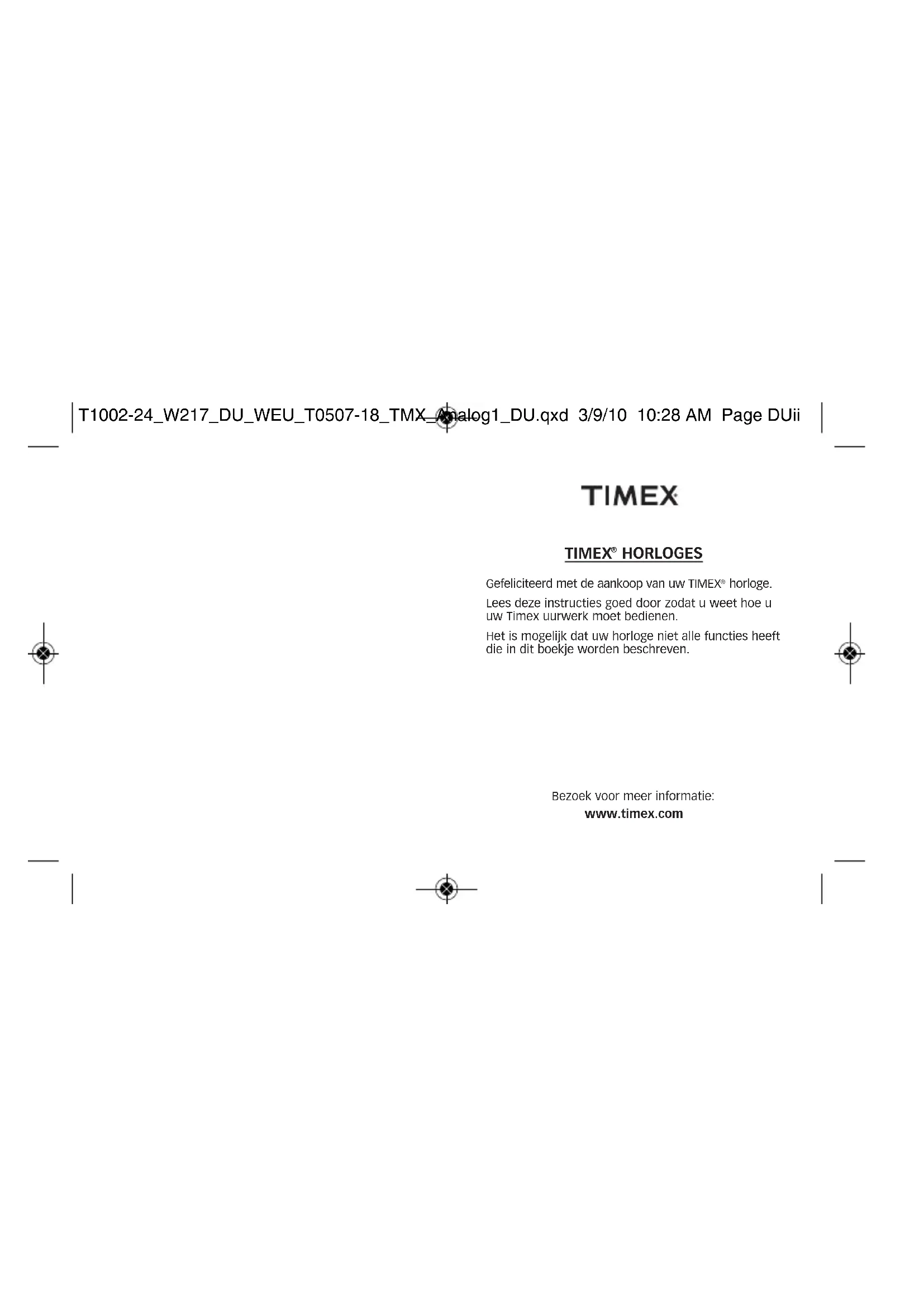 horloge. Lees deze instructies goed door zodat u weet hoe u uw Timex uurwerk moet bedienen. Het is mogelijk dat uw horloge niet alle functies heeft die in dit boekje worden beschreven. Bezoek voor meer informatie: www.timex.com T1002-24_W217_DU_WEU_T0507-18_TMX_Analog1_DU.qxd 3/9/10 10:28 AM Page DUiiINHOUDSOPGAVE 58 Uw horloge starten 59 Waterbestendigheid en schokvastheid 60 Indiglo