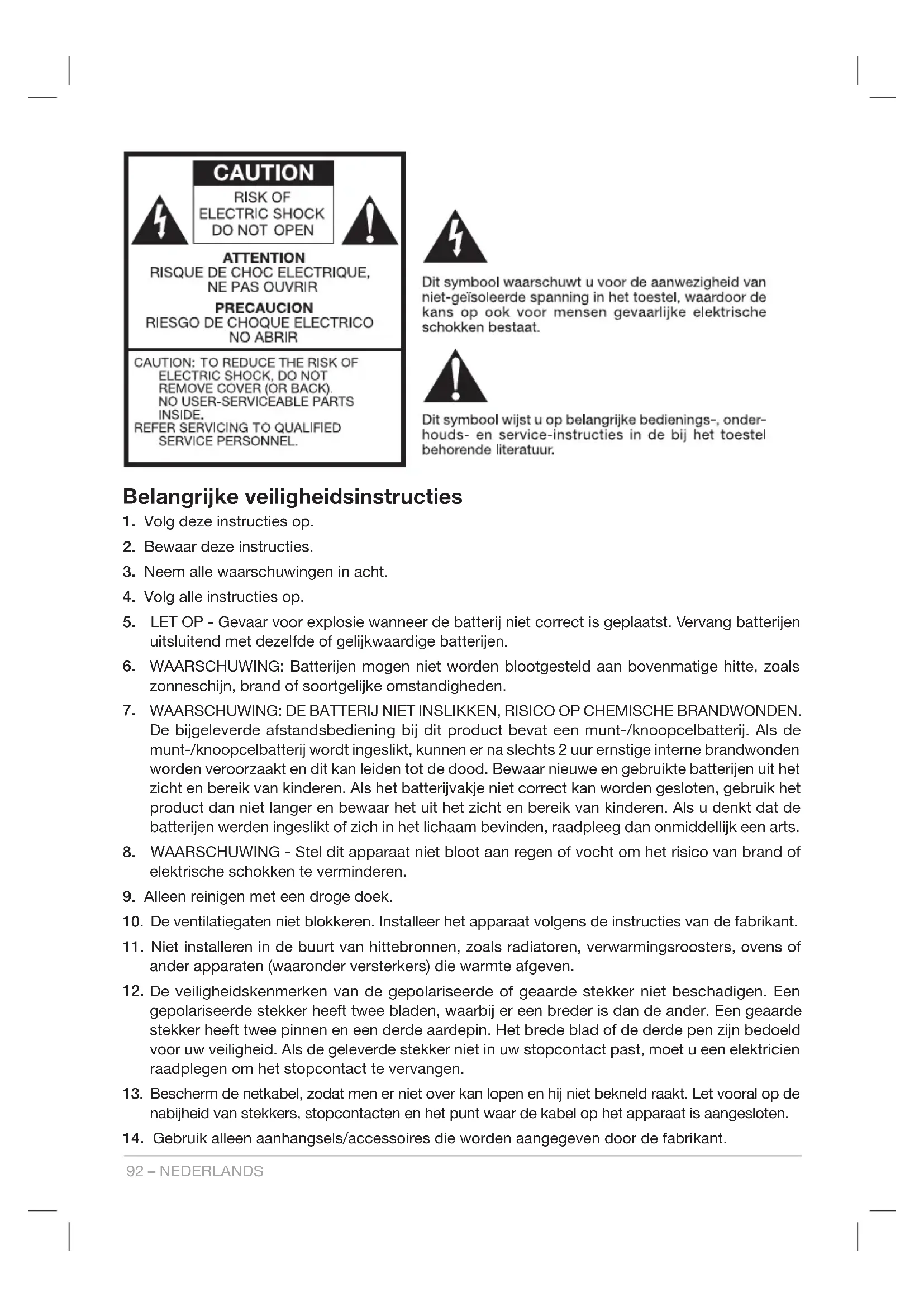 8. WAARSCHUWING - Stel dit apparaat niet bloot aan regen of vocht om het risico van brand of