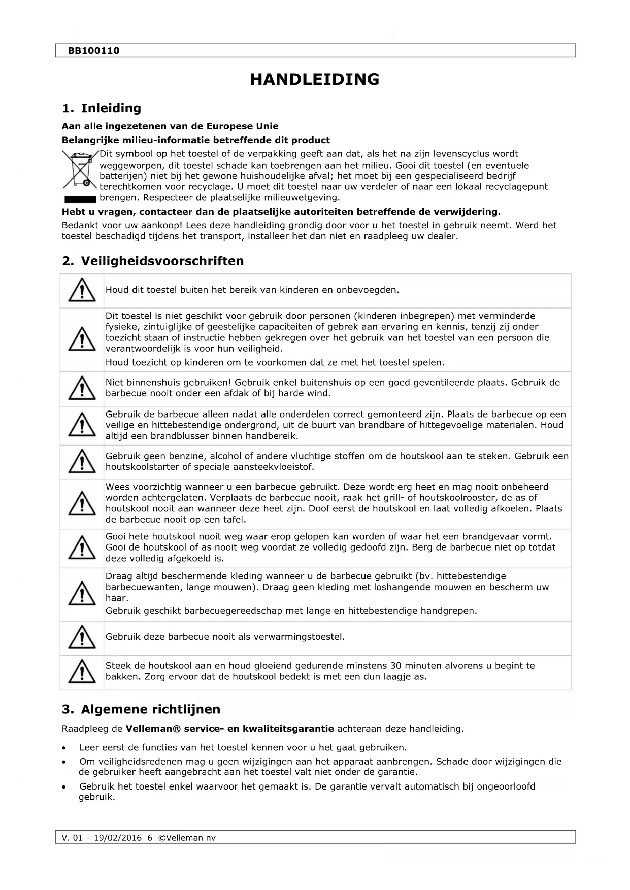afmetingen .................................................................................................... 96 x 37 x 95 cm afmetingen grillrooster (2 st.) .................................................................................. 40 x 33 cm max. aanbevolen hoeveelheid houtskool ..........................................................................3.0 kg kleur ............................................................................................................................. zwart Gebruik dit toestel enkel met originele accessoires. Velleman nv is niet aansprakelijk voor schade of kwetsuren bij (verkeerd) gebruik van dit toestel. Voor meer informatie over dit product en de laatste versie van deze handleiding, zie www.perel.eu. De informatie in deze handleiding kan te allen tijde worden gewijzigd zonder voorafgaande kennisgeving. © AUTEURSRECHT Velleman nv heeft het auteursrecht voor deze handleiding. Alle wereldwijde rechten voorbehouden. Het is niet toegestaan om deze handleiding of gedeelten ervan over te nemen, te kopiëren, te vertalen, te bewerken en op te slaan op een elektronisch medium zonder voorafgaande schriftelijke toestemming van de rechthebbende.BB100110