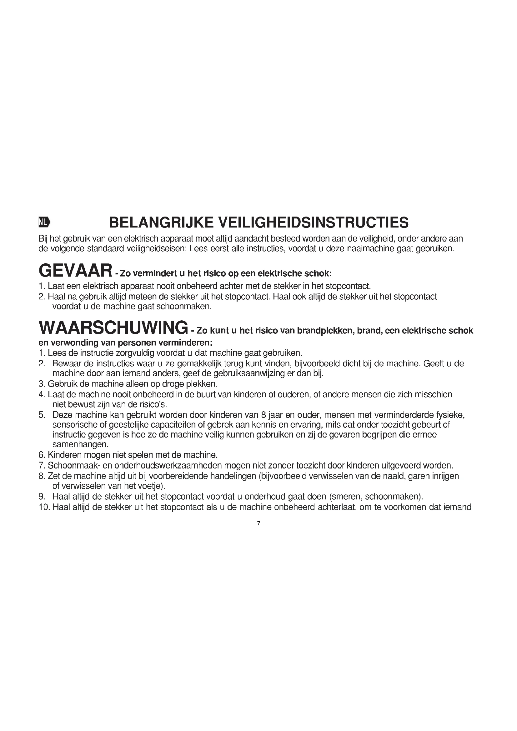 6BELANGRIJKE VEILIGHEIDSINSTRUCTIES Bij het gebruik van een elektrisch apparaat moet altijd aandacht besteed worden aan de veiligheid, onder andere aan de volgende standaard veiligheidseisen: Lees eerst alle instructies, voordat u deze naaimachine gaat gebruiken.