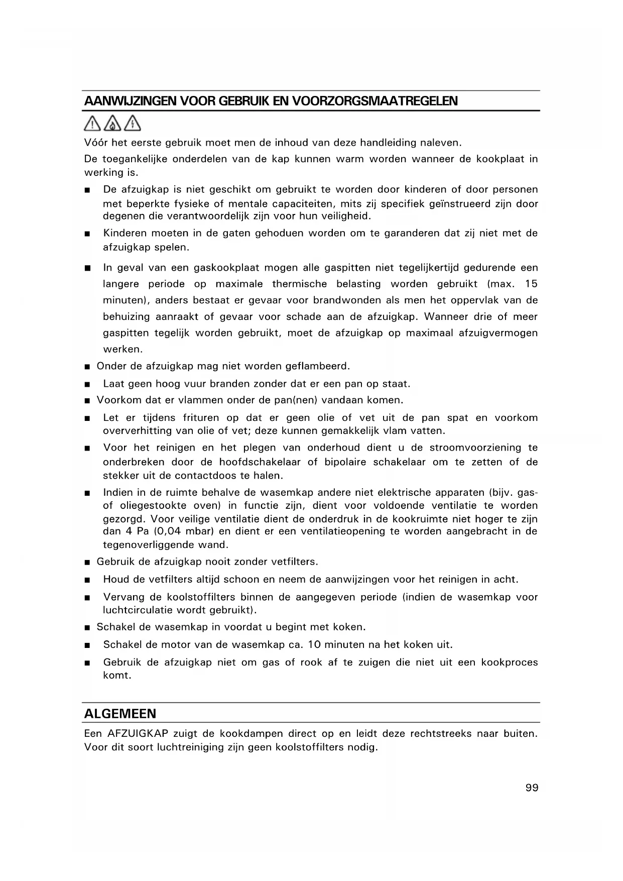 Vóór het eerste gebruik moet men de inhoud van deze handleiding naleven. De toegankelijke onderdelen van de kap kunnen warm worden wanneer de kookplaat in werking is. ■ De afzuigkap is niet geschikt om gebruikt te worden door kinderen of door personen met beperkte fysieke of mentale capaciteiten, mits zij specifiek geïnstrueerd zijn door degenen die verantwoordelijk zijn voor hun veiligheid. ■ Kinderen moeten in de gaten gehoduen worden om te garanderen dat zij niet met de afzuigkap spelen. ■ In geval van een gaskookplaat mogen alle gaspitten niet tegelijkertijd gedurende een langere periode op maximale thermische belasting worden gebruikt (max. 15 minuten), anders bestaat er gevaar voor brandwonden als men het oppervlak van de behuizing aanraakt of gevaar voor schade aan de afzuigkap. Wanneer drie of meer gaspitten tegelijk worden gebruikt, moet de afzuigkap op maximaal afzuigvermogen werken. ■ Onder de afzuigkap mag niet worden geflambeerd. ■ Laat geen hoog vuur branden zonder dat er een pan op staat. ■ Voorkom dat er vlammen onder de pan(nen) vandaan komen. ■ Let er tijdens frituren op dat er geen olie of vet uit de pan spat en voorkom oververhitting van olie of vet; deze kunnen gemakkelijk vlam vatten. ■ Voor het reinigen en het plegen van onderhoud dient u de stroomvoorziening te onderbreken door de hoofdschakelaar of bipolaire schakelaar om te zetten of de stekker uit de contactdoos te halen. ■ Indien in de ruimte behalve de wasemkap andere niet elektrische apparaten (bijv. gas- of oliegestookte oven) in functie zijn, dient voor voldoende ventilatie te worden gezorgd. Voor veilige ventilatie dient de onderdruk in de kookruimte niet hoger te zijn dan 4 Pa (0,04 mbar) en dient er een ventilatieopening te worden aangebracht in de tegenoverliggende wand. ■ Gebruik de afzuigkap nooit zonder vetfilters. ■ Houd de vetfilters altijd schoon en neem de aanwijzingen voor het reinigen in acht. ■ Vervang de koolstoffilters binnen de aangegeven periode (indien de wasemkap voor luchtcirculatie wordt gebruikt). ■ Schakel de wasemkap in voordat u begint met koken. ■ Schakel de motor van de wasemkap ca. 10 minuten na het koken uit. ■ Gebruik de afzuigkap niet om gas of rook af te zuigen die niet uit een kookproces komt. ALGEMEEN Een AFZUIGKAP zuigt de kookdampen direct op en leidt deze rechtstreeks naar buiten. Voor dit soort luchtreiniging zijn geen koolstoffilters nodig.100