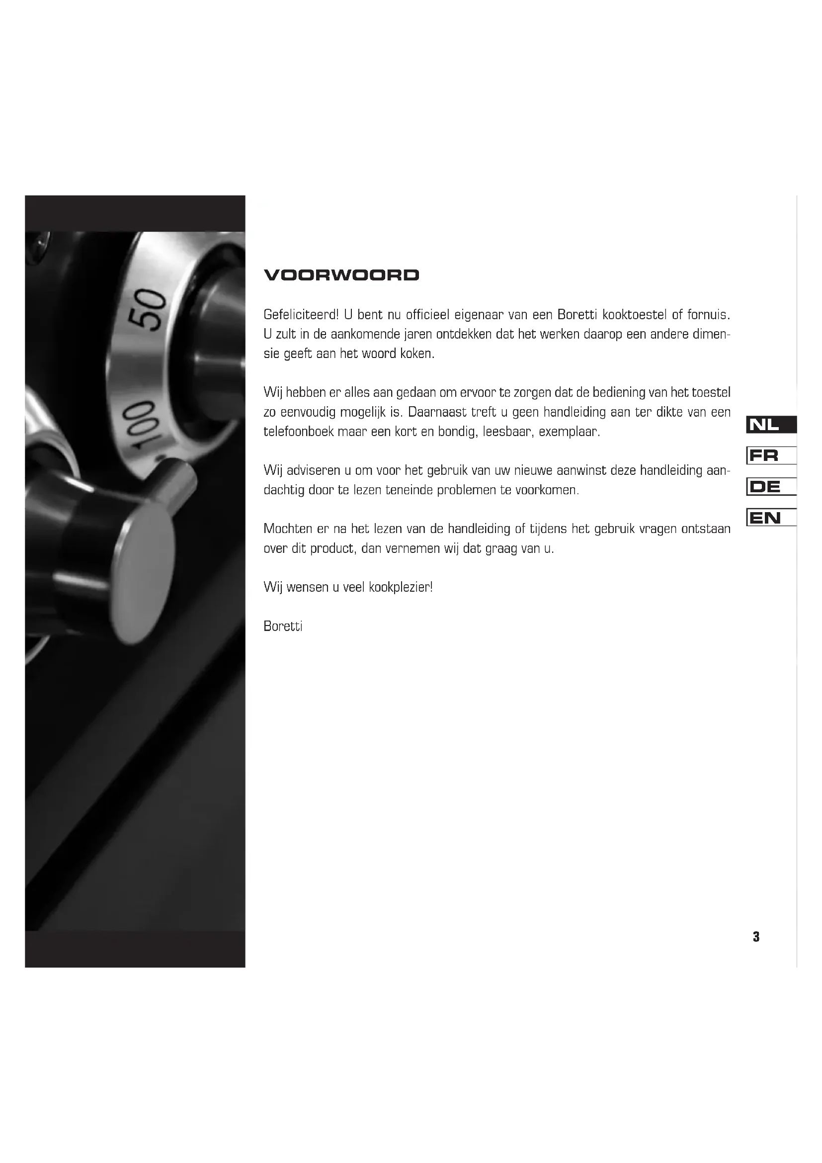 Vóór het eerste gebruik Veiligheidsvoorschriften Deze handleiding is een onderdeel van het fornuis. Hij moet gedurende de volledige levensduur van het fornuis binnen bereik worden bewaard. Wij bevelen u aan om deze handleiding zorgvuldig door te lezen alvorens u het fornuis in gebruik neemt. De installatie dient te geschieden door gekwalificeerd personeel en in overeenstemming met de installatievoorschriften zoals in het hoofd- stuk hiervoor beschreven. Dit fornuis is geschikt voor huishoudelijk gebruik en beantwoordt op dit moment aan de huidige EEG-richtlijnen. Het fornuis is gefabriceerd voor het koken en bakken van voedsel. Boretti kan niet aansprakelijk worden gesteld bij het anderzijds gebruiken van het toestel zoals bijvoorbeeld het verwarmen van ruimten. Blokkeer de openingen en gleuven van uw Boretti nooit teneinde een juiste ventilatie te waarborgen. Dit geldt ook voor de luchtsleuven aan de boven/ achterzijde van het kookoppervlak echter alleen bij de gasgeventileerde ovens. Onmiddellijk na de installatie dient het fornuis grondig getest te worden waarbij eventuele sto- ringen gemeld dienen te worden. Plaats nooit pannen of voorwerpen op het fornuis welke geen gladde en vlakke ondergrond hebben. Zet nooit ontvlambare producten in uw oven- ruimte. Een onverwachte ontsteking ervan zou tot brand kunnen leiden. Het fornuis is bedoeld voor het gebruik door vol- wassenen laat kinderen nooit onbeheerd achter bij het fornuis. Bepaalde delen zoals het grillele- ment kunnen extreem heet worden. Laat daarom niet toe dat kinderen in de buurt van het fornuis spelen of i.d. Na ieder gebruik dient gecontroleerd te wor- den dat alle bedieningsknoppen in de ‘uit’ stand staan. Bij twijfel over de veiligheidsvoorschriften van uw Boretti verzoeken wij u dringend om te bellen met Boretti. De telefoonnummers vindt u achterop deze handleiding. Gebruik tijdens het grillen geen bakpapier. Leg nooit ontvlambare zaken of producten die bij een lage temperatuur kunnen smelten in de op- bergruimte onder de ovenruimte. Milieuvoorschriften Laat de verpakkingsresten nooit onbeheerd ach- ter. Scheid de diverse verpakkingsmaterialen per soort en lever ze af bij het dichtstbijzijnde afval- scheidingstation binnen uw gemeente. Wij gebruiken voor de verpakking van onze pro- ducten niet-vervuilende en dus milieuvriendelijke en recyclebare materialen. Wij vragen daarom uw medewerking door te zorgen voor een juiste verwerking van het verpakkingsmateriaal. De adressen van de centra voor het verzamelen, de recycling of de verwerking zijn beschikbaar bij uw wederverkoper of bij de plaatselijke betrokken in- stanties. Laat de verpakking of delen ervan niet zomaar ergens achter. Dit kan gevaar van verstik- king opleveren voor kinderen, vooral de plastic zakjes. U moet ook zorgen voor een correcte ver- werking van het oude apparaat. Belangrijk: bezorg het apparaat bij het plaatse- lijk bevoegde bedrijf voor het inzamelen van af- gedankte huishoudelijke apparaten. Met een cor- recte verwerking kunnen waardevolle materialen op intelligente wijze gerecycled worden. Voordat u8 uw apparaat wegdoet is het belangrijk dat u de deuren verwijdert en de rekken in de gebruiks- stand laat om te voorkomen dat spelende kinde- ren opgesloten raken in de ovenruimte. Verder moet u de elektrische voedingskabel afsnijden en samen met de stekker verwijderen. De richtlijn bepaalt de normen voor het inzamelen en recyclen van de afgedankte apparatuur welke gelden voor het gehele territorium van de Europese Unie. Reiniging vóór het eerste gebruik Het is raadzaam om alle verpakkingsresten die in en om het fornuis aanwezig zijn goed te verwijde- ren en vervolgens het fornuis te reinigen conform de richtlijnen. Voor het eerste gebruik van de ovens dient u de oven(s) een half uur op vol vermogen in te bran- den. Tijdens het inbranden ontstaat er een nare schroeilucht. Dit is normaal. Wij adviseren u om tijdens het inbranden van de oven de keukenruimte goed te ventileren.9