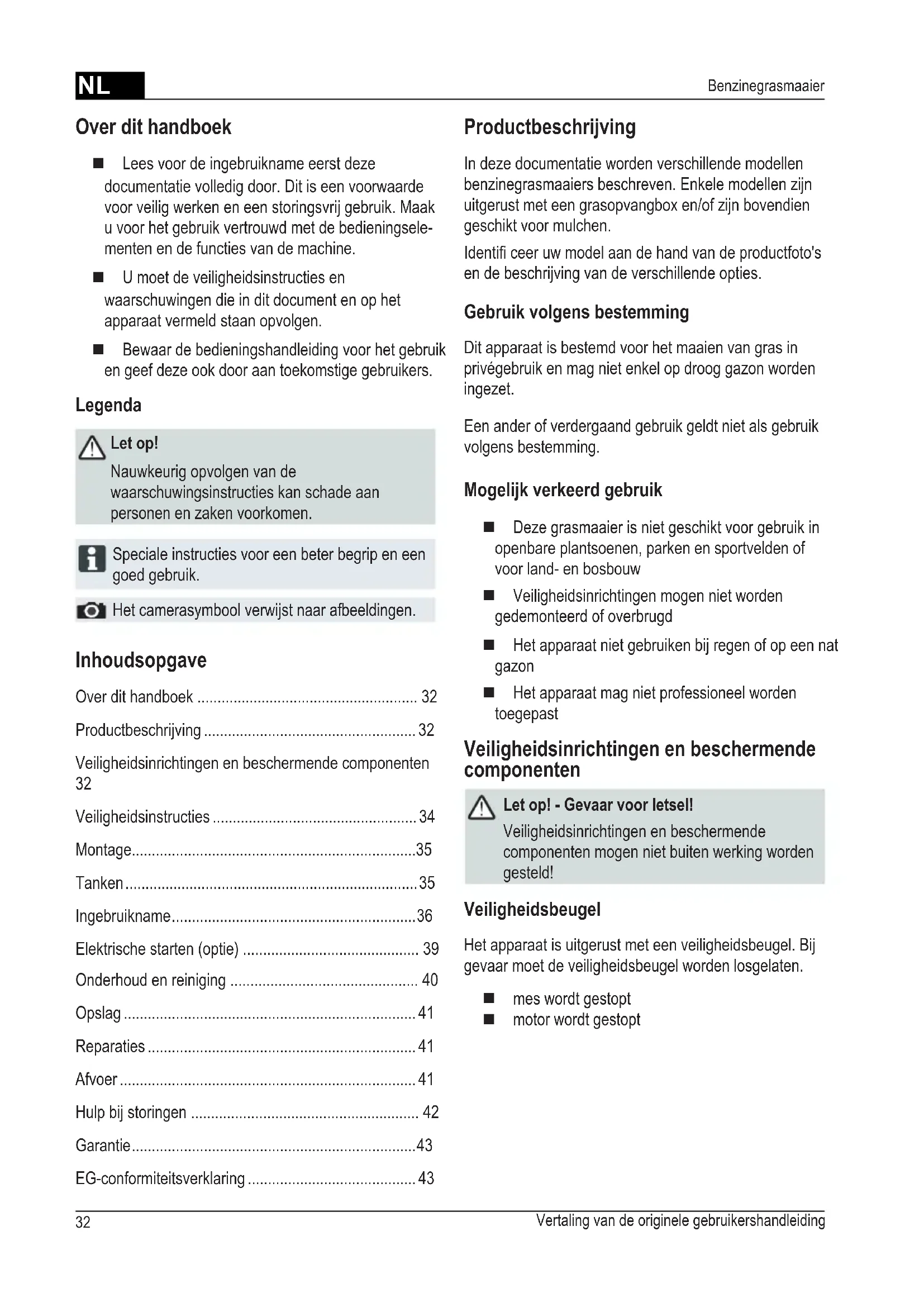 - EG-conformiteitsverklaring Over dit handboek Lees voor de ingebruikname eerst deze documentatie volledig door. Dit is een voorwaarde voor veilig werken en een storingsvrij gebruik. Maak u voor het gebruik vertrouwd met de bedieningsele- menten en de functies van de machine. U moet de veiligheidsinstructies en waarschuwingen die in dit document en op het apparaat vermeld staan opvolgen. Bewaar de bedieningshandleiding voor het gebruik en geef deze ook door aan toekomstige gebruikers. Legenda Let op! Nauwkeurig opvolgen van de waarschuwingsinstructies kan schade aan personen en zaken voorkomen. Speciale instructies voor een beter begrip en een goed gebruik. Het camerasymbool verwijst naar afbeeldingen. Productbeschrijving In deze documentatie worden verschillende modellen benzinegrasmaaiers beschreven. Enkele modellen zijn uitgerust met een grasopvangbox en/of zijn bovendien geschikt voor mulchen. Identifi ceer uw model aan de hand van de productfoto's en de beschrijving van de verschillende opties. Gebruik volgens bestemming Dit apparaat is bestemd voor het maaien van gras in privégebruik en mag niet enkel op droog gazon worden ingezet. Een ander of verdergaand gebruik geldt niet als gebruik volgens bestemming. Mogelijk verkeerd gebruik Deze grasmaaier is niet geschikt voor gebruik in openbare plantsoenen, parken en sportvelden of voor land- en bosbouw Veiligheidsinrichtingen mogen niet worden gedemonteerd of overbrugd Het apparaat niet gebruiken bij regen of op een nat gazon Het apparaat mag niet professioneel worden toegepast Veiligheidsinrichtingen en beschermende componenten Let op! - Gevaar voor letsel! Veiligheidsinrichtingen en beschermende componenten mogen niet buiten werking worden gesteld! Veiligheidsbeugel Het apparaat is uitgerust met een veiligheidsbeugel. Bij gevaar moet de veiligheidsbeugel worden losgelaten. mes wordt gestopt motor wordt gestoptNL p. 43