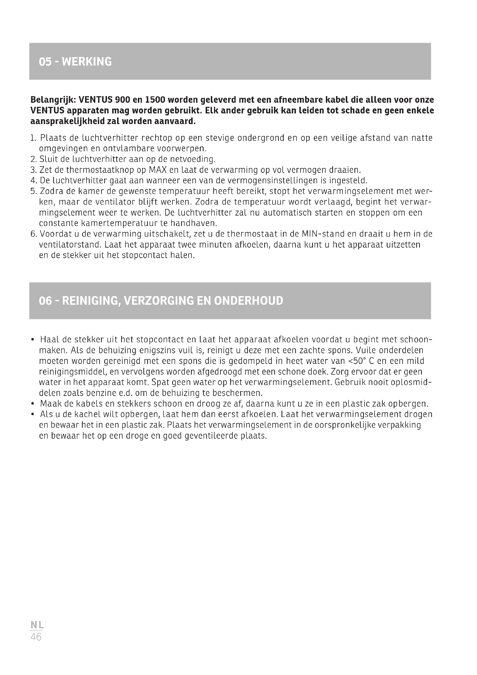 Belangrijk: VENTUS en worden geleverd met een afneembare kabel die alleen voor onze VENTUS apparaten mag worden gebruikt. Elk ander gebruik kan leiden tot schade en geen enkele aansprakelijkheid zal worden aanvaard.