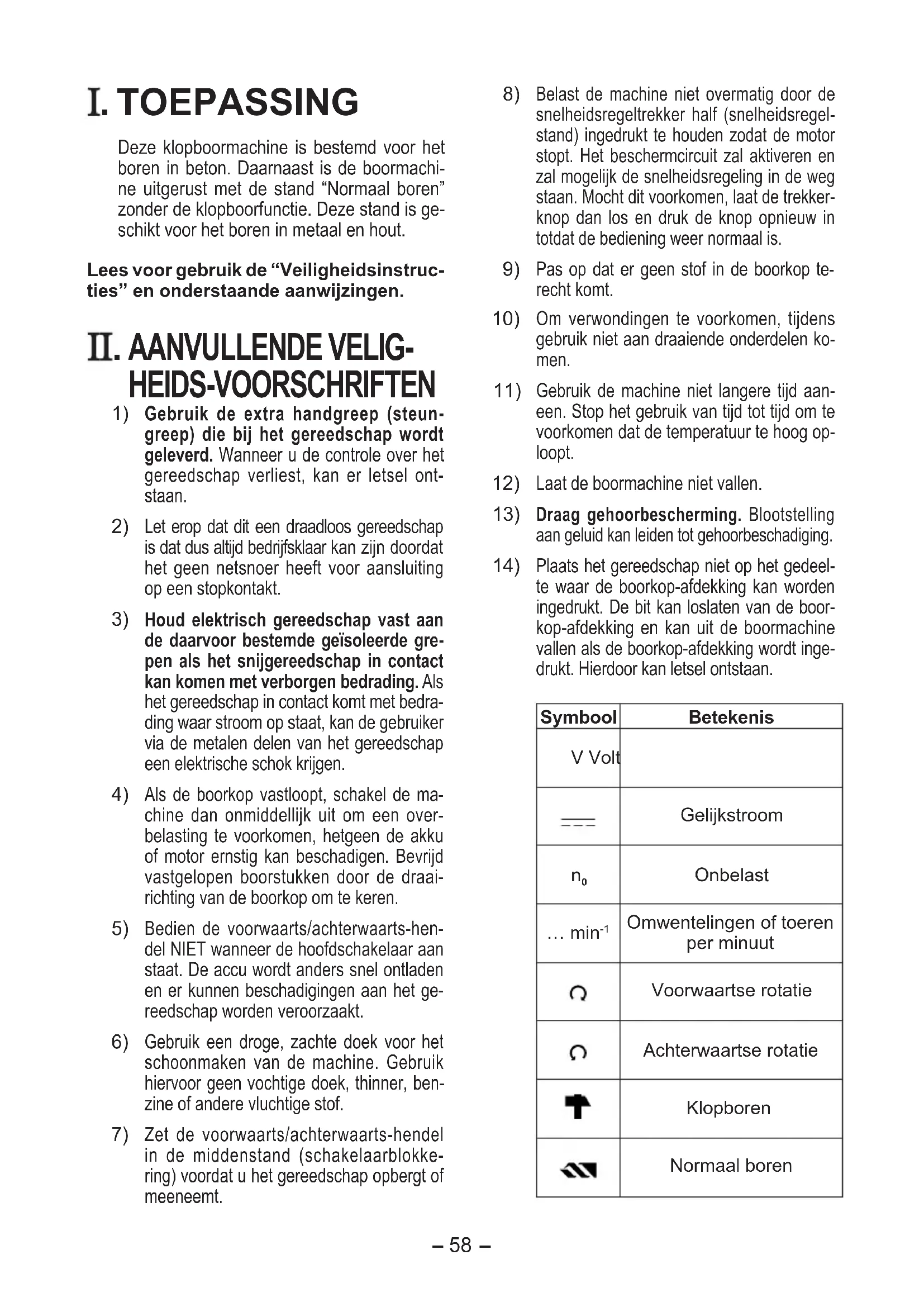 . TOEPASSING Deze klopboormachine is bestemd voor het boren in beton. Daarnaast is de boormachi- ne uitgerust met de stand “Normaal boren” zonder de klopboorfunctie. Deze stand is ge- schikt voor het boren in metaal en hout. Lees voor gebruik de “Veiligheidsinstruc- ties” en onderstaande aanwijzingen.