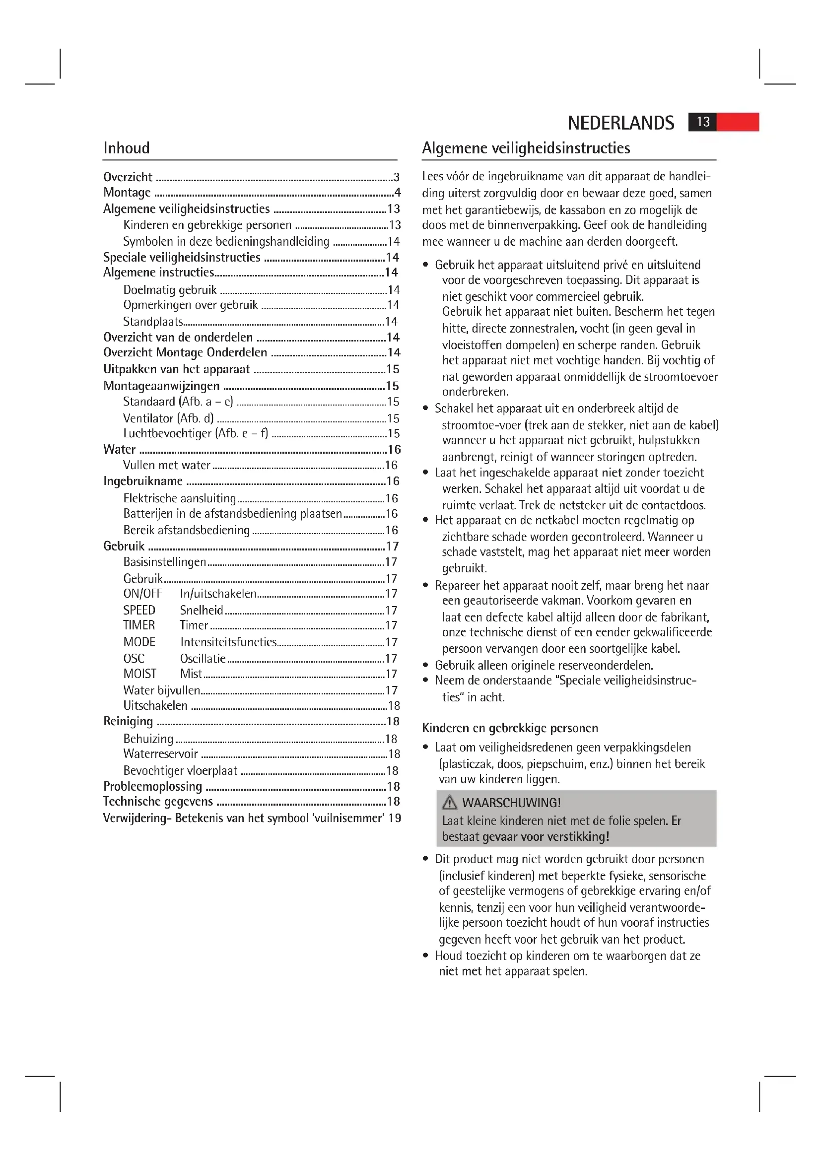- Houd toezicht op kinderen om te waarborgen dat ze niet met het apparaat spelen. Inhoud Overzicht ........................................................................................3 Montage .........................................................................................4 Algemene veiligheidsinstructies ..........................................13 Kinderen en gebrekkige personen ......................................13 Symbolen in deze bedieningshandleiding ......................14 Speciale veiligheidsinstructies .............................................14 Algemene instructies...............................................................14 Doelmatig gebruik ....................................................................14 Opmerkingen over gebruik ...................................................14 Standplaats ..................................................................................14 Overzicht van de onderdelen ................................................14 Overzicht Montage Onderdelen ...........................................14 Uitpakken van het apparaat .................................................15 Montageaanwijzingen ............................................................15 Standaard (Afb. a – c) .............................................................15 Ventilator (Afb. d) .....................................................................15 Luchtbevochtiger (Afb. e – f) ...............................................15 Water ............................................................................................16 Vullen met water ......................................................................16 Ingebruikname ..........................................................................16 Elektrische aansluiting ............................................................16 Batterijen in de afstandsbediening plaatsen .................16 Bereik afstandsbediening ......................................................16 Gebruik ........................................................................................17 Basisinstellingen ........................................................................17 Gebruik ..........................................................................................17 ON/OFF In/uitschakelen ....................................................17 SPEED Snelheid .................................................................17 TIMER Timer .......................................................................17 MODE Intensiteitsfuncties ............................................17 OSC Oscillatie ................................................................17 MOIST Mist ..........................................................................17 Water bijvullen ...........................................................................17 Uitschakelen ................................................................................18 Reiniging .....................................................................................18 Behuizing .....................................................................................18 Waterreservoir ............................................................................18 Bevochtiger vloerplaat ...........................................................18 Probleemoplossing ...................................................................18 Technische gegevens ...............................................................18 Verwijdering- Betekenis van het symbool ‘vuilnisemmer’ 1914 NEDERLANDS Symbolen in deze bedieningshandleiding Belangrijke aanwijzingen voor uw veiligheid zijn speciaal gekenmerkt. Neem deze aanwijzingen strikt in acht om ongevallen en schade aan het apparaat te vermijden: WAARSCHUWING: Waarschuwt voor gevaren voor uw gezondheid en toont mogelijk letselrisico’s. LET OP: Wijst op mogelijke gevaren voor het apparaat of andere voorwerpen. OPMERKING: Kenmerkt tips en informatie voor u. Speciale veiligheidsinstructies