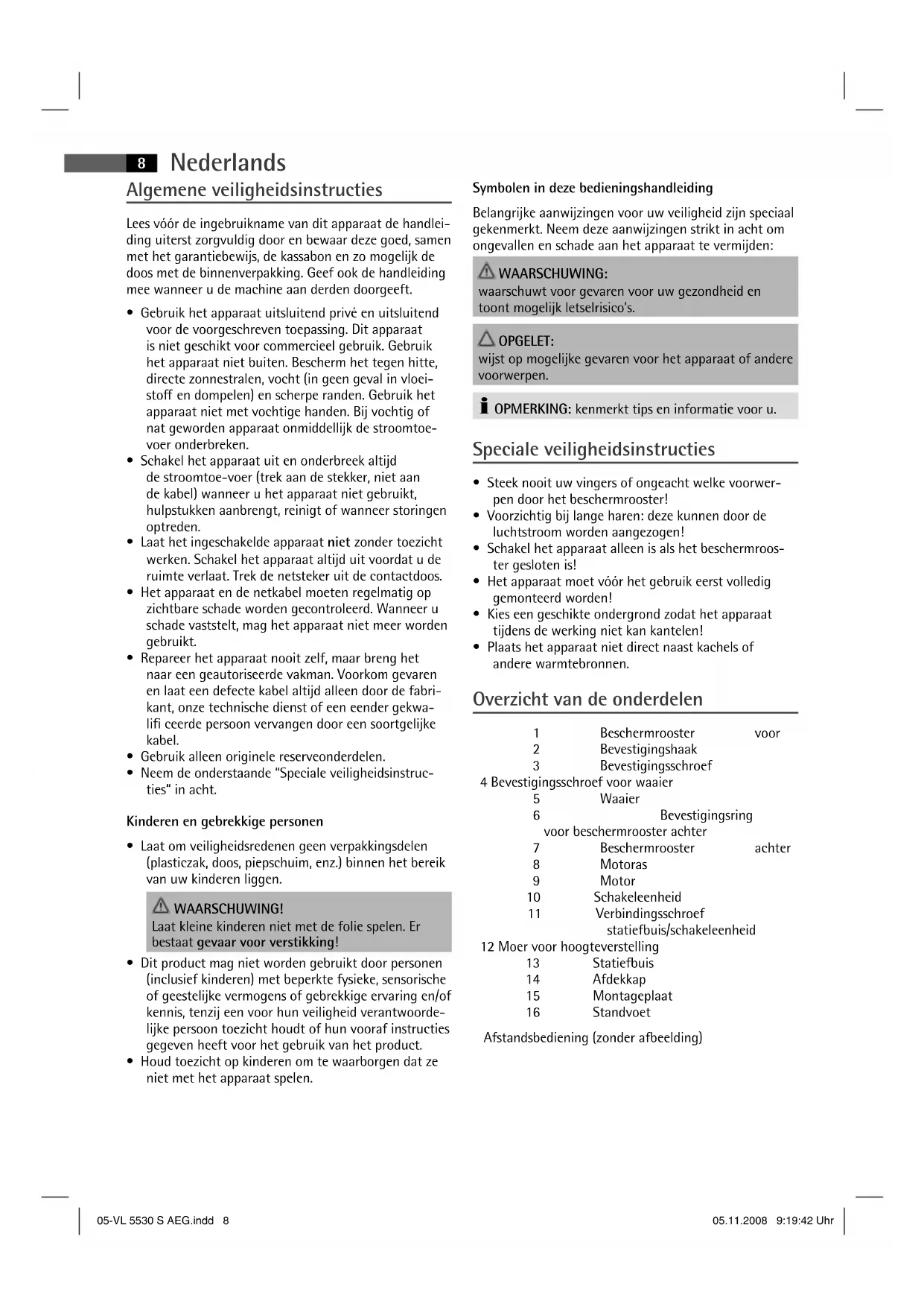 - Plaats het apparaat niet direct naast kachels of andere warmtebronnen. Overzicht van de onderdelen 1 Beschermrooster voor 2 Bevestigingshaak 3 Bevestigingsschroef 4 Bevestigingsschroef voor waaier 5 Waaier 6 Bevestigingsring voor beschermrooster achter 7 Beschermrooster achter 8 Motoras 9 Motor 10 Schakeleenheid 11 Verbindingsschroef statiefbuis/schakeleenheid 12 Moer voor hoogteverstelling 13 Statiefbuis 14 Afdekkap 15 Montageplaat 16 Standvoet Afstandsbediening (zonder afbeelding) 05-VL 5530 S AEG.indd 805-VL 5530 S AEG.indd 8 05.11.2008 9:19:42 Uhr05.11.2008 9:19:42 UhrNederlands