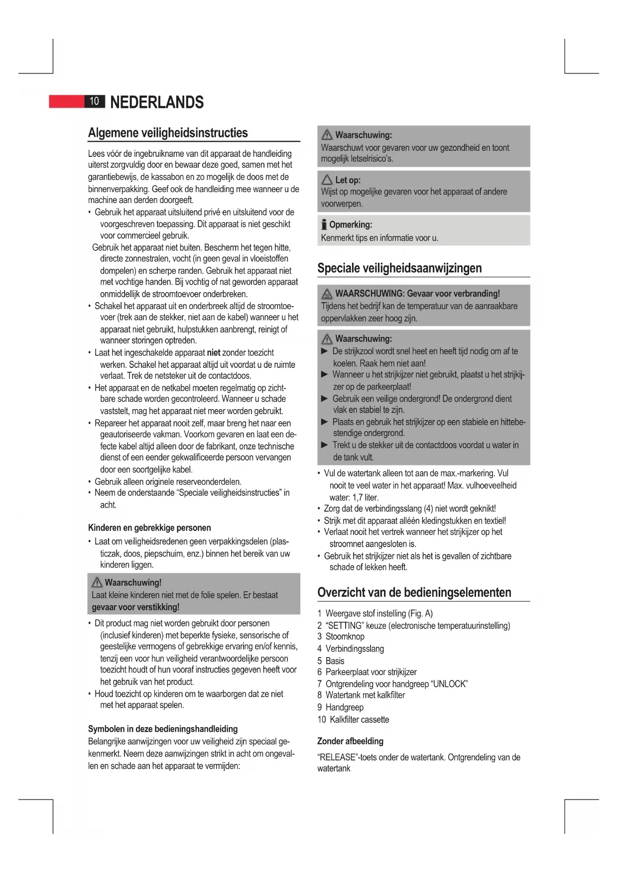 - Gebruik het strijkijzer niet als het is gevallen of zichtbare schade of lekken heeft. Overzicht van de bedieningselementen 1 Weergave stof instelling (Fig. A) 2 “SETTING” keuze (electronische temperatuurinstelling) 3 Stoomknop 4 Verbindingsslang 5 Basis 6 Parkeerplaat voor strijkijzer 7 Ontgrendeling voor handgreep “UNLOCK” 8 Watertank met kalklter 9 Handgreep 10 Kalklter cassette Zonder afbeelding “RELEASE”-toets onder de watertank. Ontgrendeling van de watertank11 NEDERLANDS Gebruiksaanwijzingen Uitpakken
