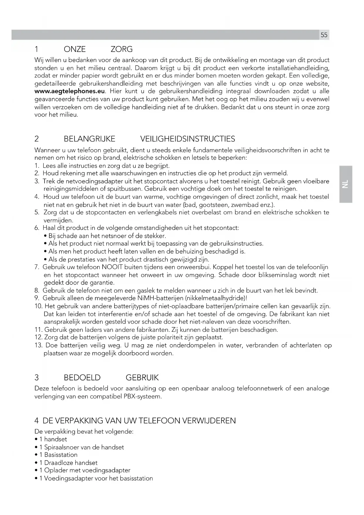 1 ONZE ZORG Wij willen u bedanken voor de aankoop van dit product. Bij de ontwikkeling en montage van dit product stonden u en het milieu centraal. Daarom krijgt u bij dit product een verkorte installatiehandleiding, zodat er minder papier wordt gebruikt en er dus minder bomen moeten worden gekapt. Een volledige, gedetailleerde gebruikershandleiding met beschrijvingen van alle functies vindt u op onze website, www.aegtelephones.eu. Hier kunt u de gebruikershandleiding integraal downloaden zodat u alle geavanceerde functies van uw product kunt gebruiken. Met het oog op het milieu zouden wij u evenwel willen verzoeken om de volledige handleiding niet af te drukken. Bedankt dat u ons steunt in onze zorg voor het milieu. 2 BELANGRIJKE VEILIGHEIDSINSTRUCTIES Wanneer u uw telefoon gebruikt, dient u steeds enkele fundamentele veiligheidsvoorschriften in acht te nemen om het risico op brand, elektrische schokken en letsels te beperken: