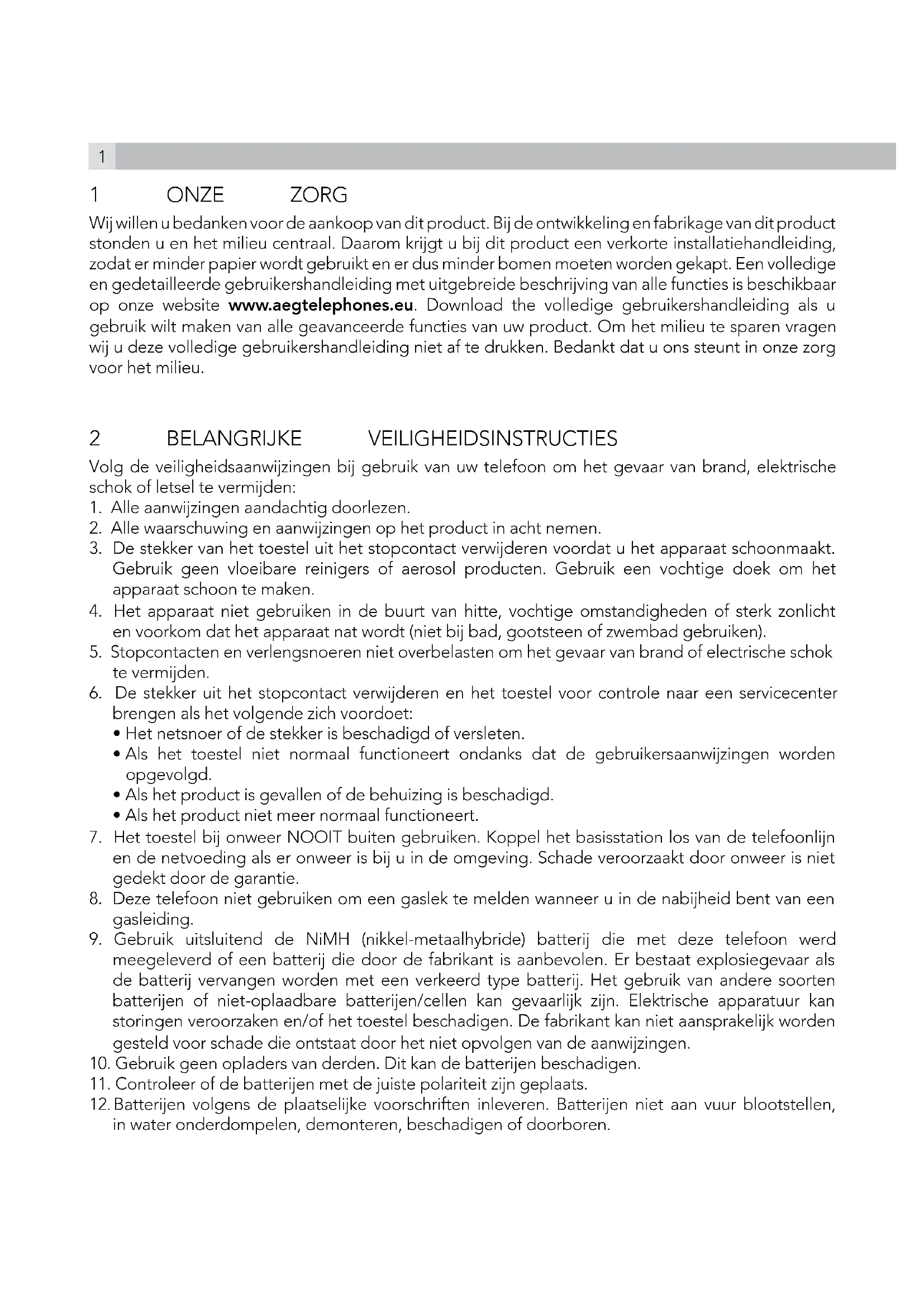 Als het toestel niet meer onder garantie valt, kunt u contact met ons opnemen via www.aegtelephones.eu Dit product werkt alleen met oplaadbare batterijen. Als u niet-oplaadbare batterijen in de handset gebruikt en de handset op het basisstation plaatst, wordt de handset beschadigd. Dit is NIET gedekt door de garantie. 15 TECHNISCHE GEGEVENS Standaard DECT Frequentiebereik 1,88 tot 1,9 GHz (bandbreedte = 20 MHz) Kanaal bandbreedte 1,728 MHz Werkbereik Tot 300 m buitenshuis; Tot 50 m binnenshuis Werkingstijd Standby: 168 uur spreektijd: 10 uur Oplaadtijd batterij: 15 uur Bedrijfstemperatuur Gebruik 0°C tot 40°C, Opslag -20°C tot 60°C Elektrische voeding Voedingsadapter voor basisstation: Ten Pao: S003IB0600050 & S003IV0600050 Ingang 100-240Vac 50-60Hz; Vermogen 6VDC/500mA. Oplader voedingsadapter: Ten Pao: S003IB0600015 & S003IV0600015 Ingang 100-240Vac 50-60Hz; Vermogen 6VDC/150mA. Batterijgegevens : 2 x 1,2V maat AAA, 650mAh NiMH (Oplaadbaar) 16 CE-VERKLARING Dit product voldoet aan de essentiële vereisten en andere relevante voorschriften van de R&TTE- richtlijn 1999/5/EC. U vindt de Conformiteitsverklaring op: www.aegtelephones.eu20