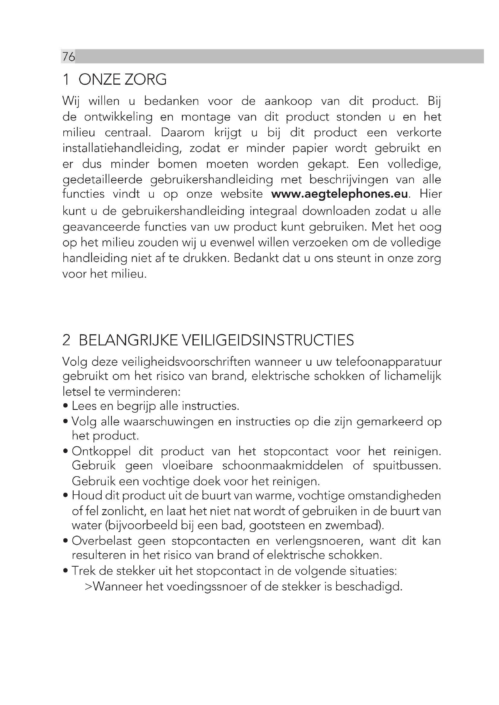 Wij willen u bedanken voor de aankoop van dit product. Bij de ontwikkeling en montage van dit product stonden u en het milieu centraal. Daarom krijgt u bij dit product een verkorte installatiehandleiding, zodat er minder papier wordt gebruikt en er dus minder bomen moeten worden gekapt. Een volledige, gedetailleerde gebruikershandleiding met beschrijvingen van alle functies vindt u op onze website www.aegtelephones.eu. Hier kunt u de gebruikershandleiding integraal downloaden zodat u alle geavanceerde functies van uw product kunt gebruiken. Met het oog op het milieu zouden wij u evenwel willen verzoeken om de volledige handleiding niet af te drukken. Bedankt dat u ons steunt in onze zorg voor het milieu. 2 BELANGRIJKE VEILIGEIDSINSTRUCTIES Volg deze veiligheidsvoorschriften wanneer u uw telefoonapparatuur gebruikt om het risico van brand, elektrische schokken of lichamelijk letsel te verminderen: