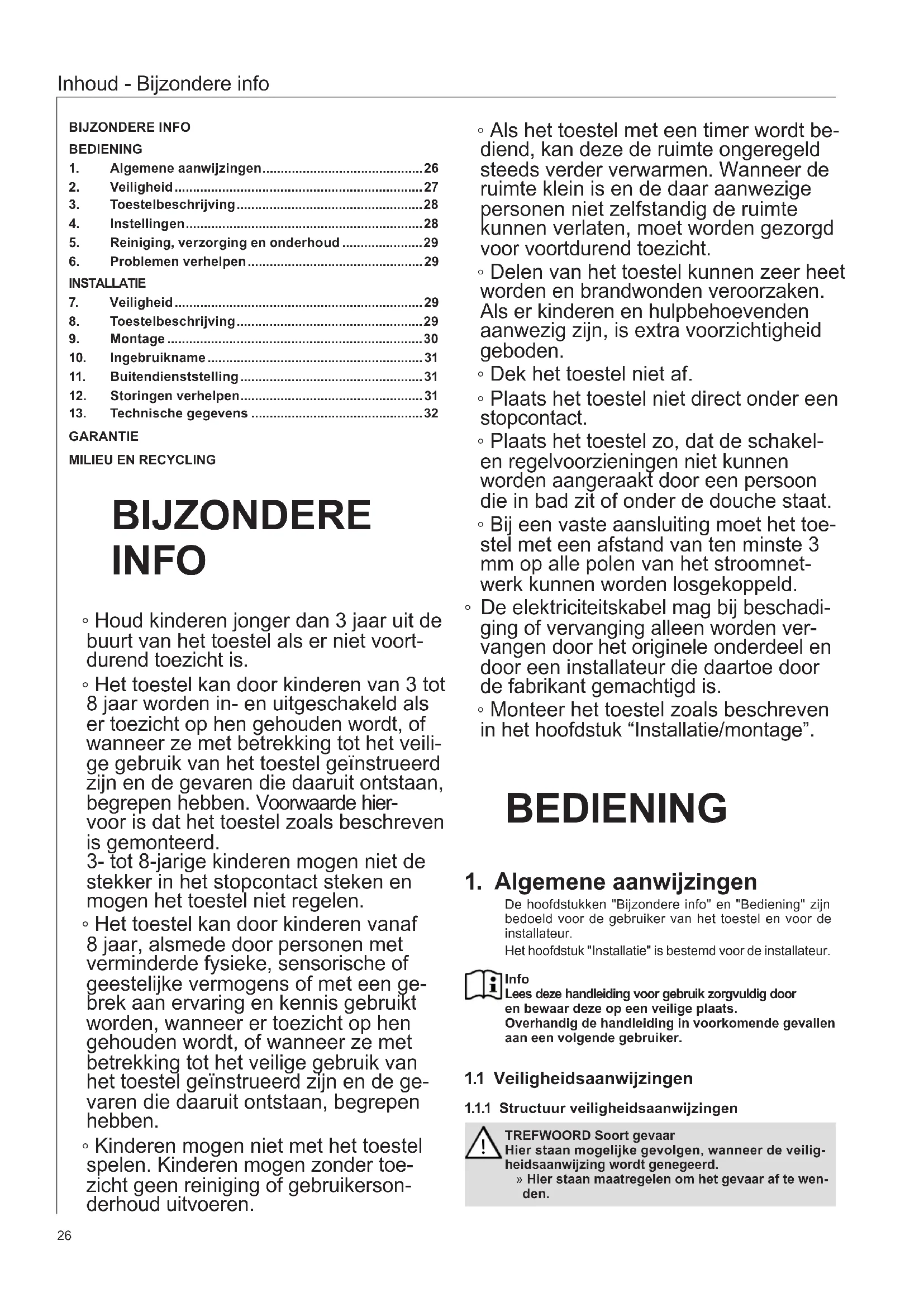 De hoofdstukken "Bijzondere info" en "Bediening" zijn bedoeld voor de gebruiker van het toestel en voor de installateur.Het hoofdstuk "Installatie" is bestemd voor de installateur. Info Lees deze handleiding voor gebruik zorgvuldig door en bewaar deze op een veilige plaats.Overhandig de handleiding in voorkomende gevallen aan een volgende gebruiker.1.1 Veiligheidsaanwijzingen1.1.1 Structuur veiligheidsaanwijzingen