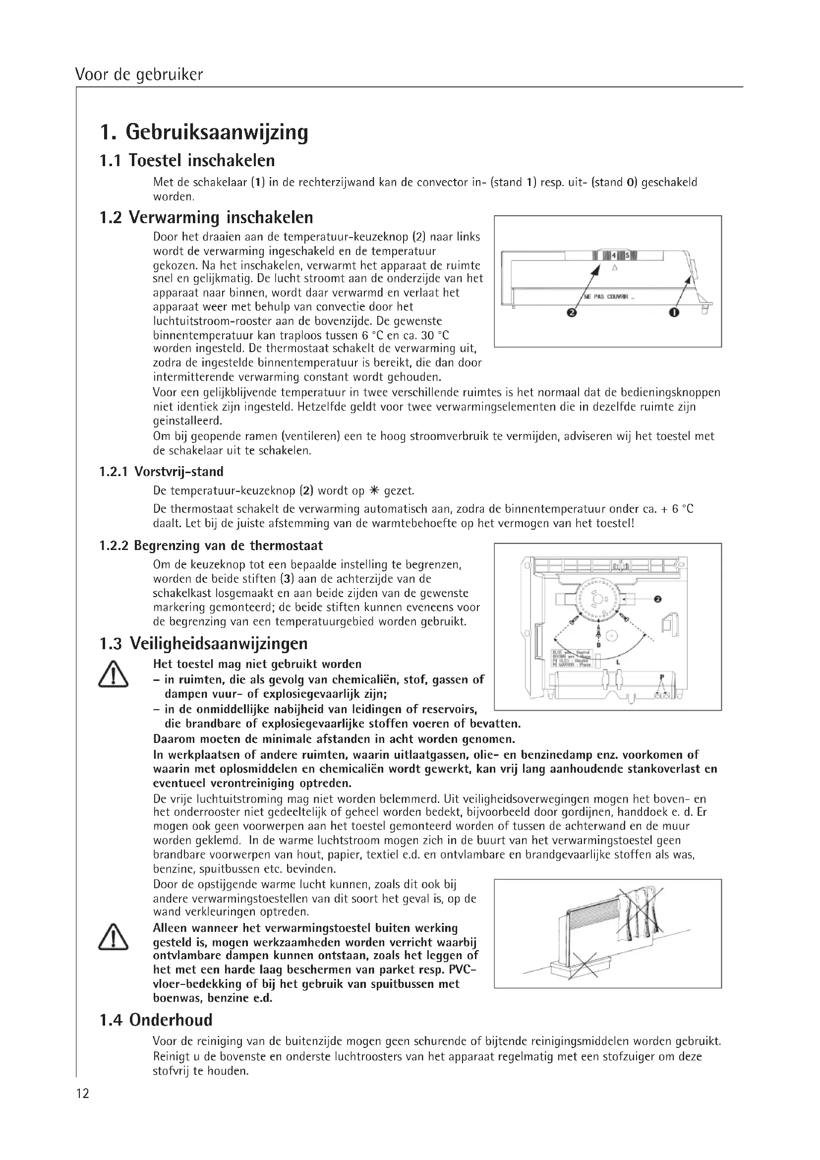 De vrije luchtuitstroming mag Niet worden belemmerd. Uit veiligheidsoverwegingen mogen het boven- en het onderrooster Niet gedeeltelijk of geheel worden bedekt, bijvoorbeeld door gordijnen, handdoek e. d. Er mogen ook geen voorwerpen aan het toestel gemonteerd worden ofussen dechterwand en de muur worden geklemd. In de warme luchtstroom mogen zich in de buurt van het verwarmingstoestel geen brandbare voorwerpen van hout, papier, textiel e.d. en ontvlambare en brandgevaarlijke stoffen als was, benzine, spuitbussen etc. bevinden.