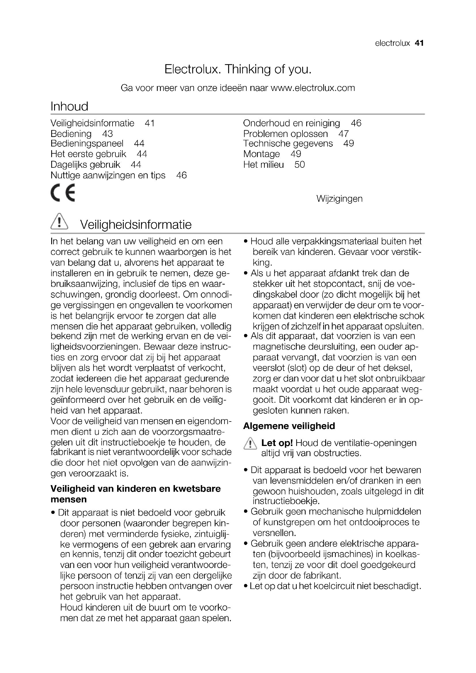 reil et les côtés. La circulation d'air derrière l'appareil doit être suffisante. En matière de sauvegarde de l'environnement Le symbole sur le produit ou son emballage indique que ce produit ne peut être traité comme déchet ménager. Il doit être remis au point de collecte dédié à cet effet (collecte et recyclage du matériel électrique et électronique). En procédant à la mise au rebut de l'appareil dans les règles de l’art, nous préservons l'environnement et notre sécurité, s’assurant ainsi que les déchets seront traités dans des conditions optimum. Pour obtenir plus de détails sur le recyclage de ce produit, veuillez prendre contact avec les services de votre commune ou le magasin où vous avez effectué l'achat. 40 electroluxElectrolux. Thinking of you. Ga voor meer van onze ideeën naar www.electrolux.com Inhoud Veiligheidsinformatie 41 Bediening 43 Bedieningspaneel 44 Het eerste gebruik 44 Dagelijks gebruik 44 Nuttige aanwijzingen en tips 46 Onderhoud en reiniging 46 Problemen oplossen 47 Technische gegevens 49 Montage 49 Het milieu 50 Wijzigingen voorbehouden Veiligheidsinformatie In het belang van uw veiligheid en om een correct gebruik te kunnen waarborgen is het van belang dat u, alvorens het apparaat te installeren en in gebruik te nemen, deze ge- bruiksaanwijzing, inclusief de tips en waar- schuwingen, grondig doorleest. Om onnodi- ge vergissingen en ongevallen te voorkomen is het belangrijk ervoor te zorgen dat alle mensen die het apparaat gebruiken, volledig bekend zijn met de werking ervan en de vei- ligheidsvoorzieningen. Bewaar deze instruc- ties en zorg ervoor dat zij bij het apparaat blijven als het wordt verplaatst of verkocht, zodat iedereen die het apparaat gedurende zijn hele levensduur gebruikt, naar behoren is geïnformeerd over het gebruik en de veilig- heid van het apparaat. Voor de veiligheid van mensen en eigendom- men dient u zich aan de voorzorgsmaatre- gelen uit dit instructieboekje te houden, de fabrikant is niet verantwoordelijk voor schade die door het niet opvolgen van de aanwijzin- gen veroorzaakt is. Veiligheid van kinderen en kwetsbare mensen