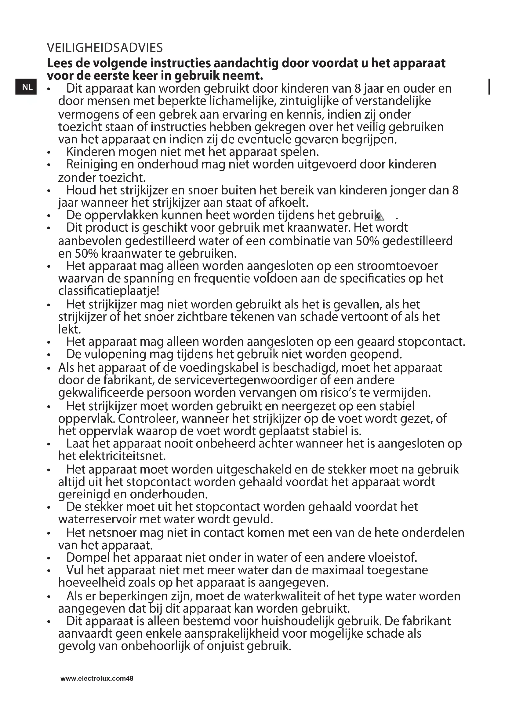 ofagressievereinigingsmiddelenopdestrijkzool. Hierdoor raakt het oppervlak beschadigd. Als u verbrandingsresten wilt verwijderen, beweegt u het strijkijzerovereenvochtigedoekterwijlhetstrijkijzer nogheetis.AlsudeGlissium™strijkzoolwiltreinigen, wrijftueroverheenmeteenzachte,vochtigedoek, waarnaudestrijkzooldroogveegt. PROBLEMEN OPLOSSEN Probleem Mogelijke oorzaak Oplossing Strijkzoolwordtnietwarmterwijlhet strijkijzerisingeschakeld. Probleem met de aansluiting Controleer het netsnoer, de stekker en het stopcontact. Temperatuurknop staat in de stand MIN. Selecteer een geschikte temperatuur. Strijkijzergeeftgeenstoom. Onvoldoende water in het reservoir. Vulhetwaterreservoir(zie“Heteerste gebruik”,nr2). Stoomknop staat in de stand voor niet- stomen. Zet de stoomknop tussen de minimale enmaximalestoomstand(zie “Strijkschema”). Gekozentemperatuurislagerdande opgegeven temperatuur voor stoom. Verhoog de temperatuur naar ten minste . Sproeifunctie werkt niet. Onvoldoende water in het reservoir. Vulhetwaterreservoir(zie“Heteerste gebruik”,nr2). Stoom- en verticale stoomfunctie werken niet. Stoomfunctieiszeervaakgebruikt binnen een korte periode. Leghetstrijkijzerhorizontaalneeren wacht even voordat u de stoomfunctie opnieuw gebruikt. Strijkijzerwordtnietwarmgenoeg. Stel de juiste temperatuur in voor strijkenmetstoom(tot ). Zet het strijkijzerverticaalneerenwacht tot het temperatuurindicatielampje uitgaat. Er komen bruine strepen uit de zoolplaattijdenshetstrijkenendeze maken vlekken op het wasgoed. U heeft hard water gebruikt waardoor erkalkafzettingenzijnontstaaninhet waterreservoir. Gebruikdezelfreinigingsfunctieéénof meerdere keren. U hebt chemische antikalkmiddelen gebruikt. Gebruik geen antikalkmiddelen. Erzittenstofvezelsindegaatjesvande zoolplaatendieverbranden. Gebruikdezelfreinigingsfunctieéén ofmeerderekeren.Maakdezoolplaat schoonmeteenzachtvochtigdoek. Destoenzijnmogelijknietgoed gespoeld of de kleding is nieuw en is niet gewassen voor het strijken. Spoel het wasgoed nogmaals grondig. VERWIJDERING Recycle de materialen met het symbool . Gooideverpakkingineengeschikteverzamelcontainer om het te recyclen. Help om het milieu en de volksgezondheidtebeschermenenrecyclehetafvalvan elektrische en elektronische apparaten. Gooi apparaten gemarkeerd met het symbool niet weg met het huishoudelijk afval. Breng het product naar het milieustation bij u in de buurt of neem contact op met de gemeente. www.electrolux.com50NO SIKKERHETSRÅD Les følgende anvisninger nøye før du bruker maskinen for første gang.