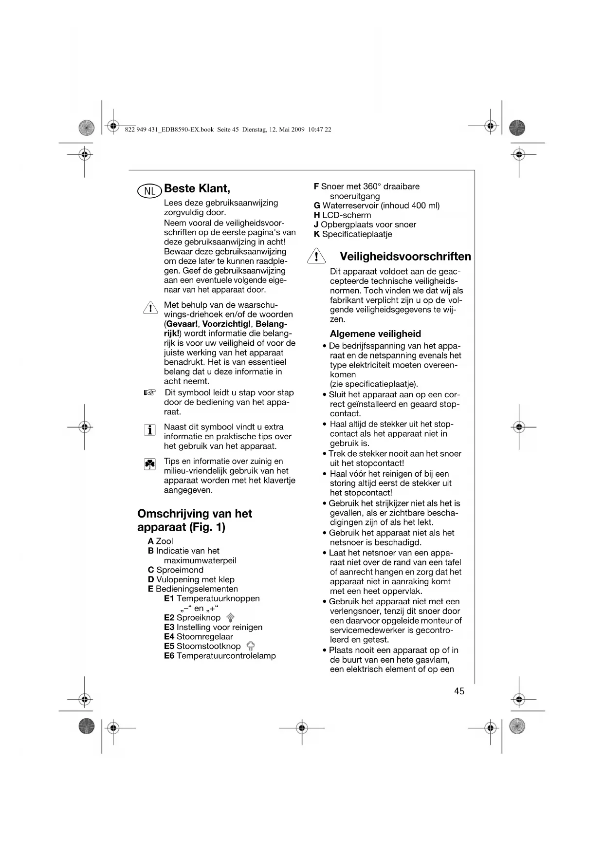 - De bedrijfsspanning van het appa-raat en de netspanning evenals het type elektriciteit moeten overeen-komen (zie specificatieplaatje). • Sluit het apparaat aan op een cor-rect geïnstalleerd en geaard stop-contact. Haal altijd de stekker uit het stop-contact als het apparaat niet in gebruik is.• Trek de stekker nooit aan het snoer uit het stopcontact! Haal vóór het reinigen of bij een storing altijd eerst de stekker uit het stopcontact! • Gebruik het strijkijzer niet als het is gevallen, als er zichtbare bescha-digingen zijn of als het lekt.• Gebruik het apparaat niet als het netsnoer is beschadigd. • Laat het netsnoer van een appa-raat niet over de rand van een tafel of aanrecht hangen en zorg dat het apparaat niet in aanraking komt met een heet oppervlak.• Gebruik het apparaat niet met een verlengsnoer, tenzij dit snoer door een daarvoor opgeleide monteur of servicemedewerker is gecontro-leerd en getest.• Plaats nooit een apparaat op of in de buurt van een hete gasvlam, een elektrisch element of op een 822 949 431_EDB8590-EX.book Seite 45 Dienstag, 12. Mai 2009 10:47 22l