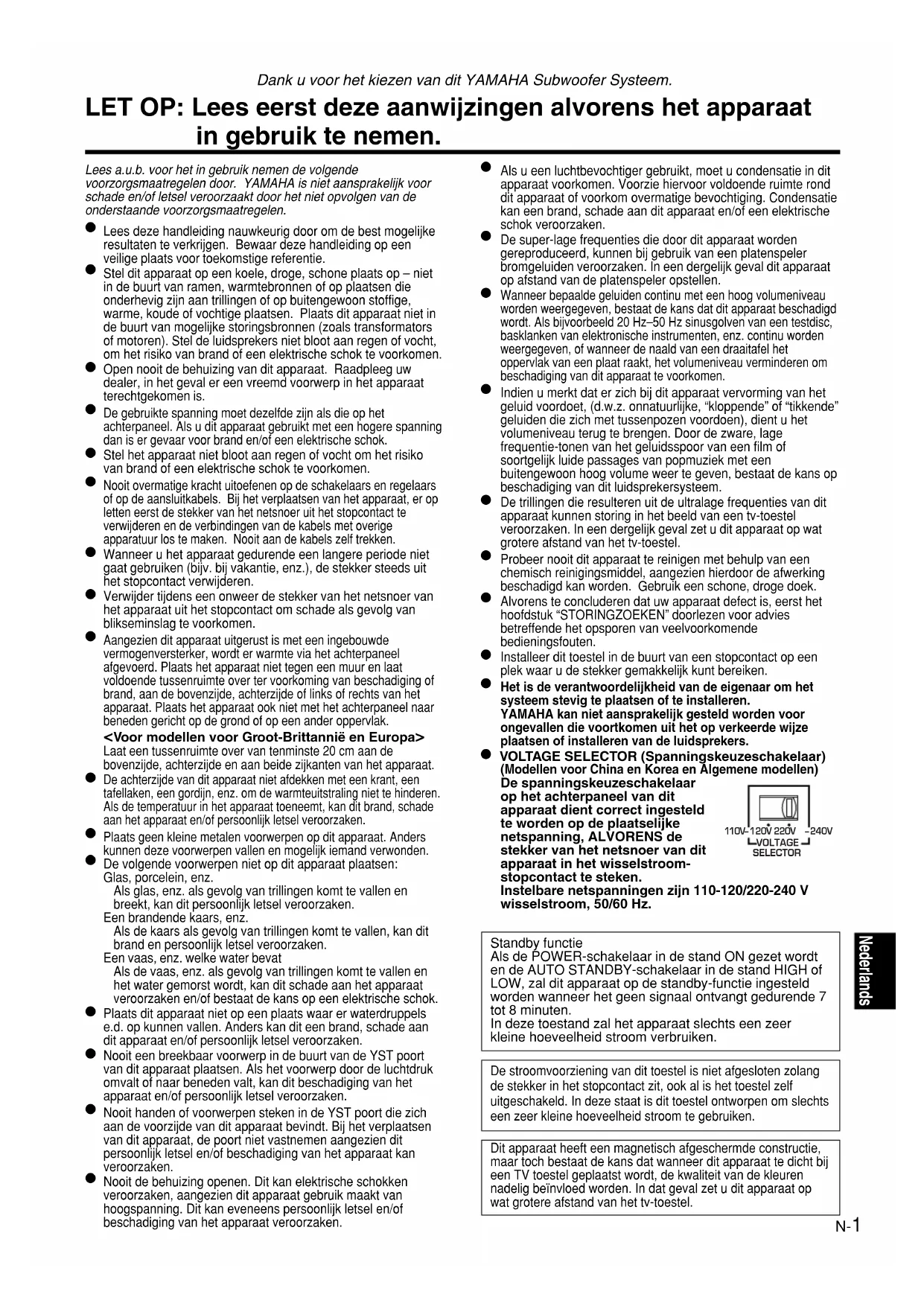 Consulte el siguiente cuadro cuando el aparato no funcione bien. Si el problema no es uno de los que aparecen en la siguiente lista o si las instrucciones de abajo no ayudan a solucionar el problema, desenchufe el cable de alimentación y llame a un distribuidor o centro de servicio autorizado de YAMAHA. Problema No hay corriente aunque el botón STANDBY/ON está en la posición ON. No se escuchan sonidos. El sonido es muy bajo. El altavoz ultragraves no se conecta automáticamente. El altavoz de ultragraves no pasa automáticamente al modo en espera. El altavoz ultragraves se conmuta al modo de espera inesperadamente. El altavoz ultragraves se conecta inesperadamente. Qué hacer Enchufar bien el cable de alimentación. Ajuste el interruptor POWER a la posición ON. Girar hacia la derecha el control VOLUME. Conectar los cables de altavoces correctamente. Conectar los cables de altavoces correctamente, L (izquierda) a L, R (derecha) a R, “+” a “+” y “–” a “–”. Ajuste el interruptor a la otra posición. Reproducir una fuente de sonido con graves. Ajuste el control HIGH CUT a una posición más alta. Cambiar de lugar los altavoces ultragraves o eliminar el paralelismo entre las superficies colocando una biblioteca, etc. a lo largo de las paredes. Ponga el interruptor POWER en la posición ON. Ajuste el botón STANDBY/ON a la posición ON. Ajuste el interruptor AUTO STANDBY a la posición “HIGH” o “LOW”. Ajuste el interruptor AUTO STANDBY a la posición “HIGH”. Aleje el altavoz ultragraves de tales equipos y/o cambie la posición de los cables de los altavoces conectados. De lo contrario, ajuste el interruptor AUTO STANDBY a la posición “OFF”. Ajuste el interruptor AUTO STANDBY a la posición “HIGH” o “LOW”. Ajuste el interruptor AUTO STANDBY a la posición “HIGH”. Aleje el altavoz ultragraves de tales equipos y/o cambie la posición de los cables de los altavoces conectados. De lo contrario, ajuste el interruptor AUTO STANDBY a la posición “OFF”. Causa El cable de alimentación no está bien enchufado. El interruptor POWER está en la posición OFF. El control VOLUME está en 0. Las conexiones de los cables de altavoces están flojas. Los cables de altavoces no están bien conectados. El interruptor PHASE no se encuentra en la posición correcta. Se está reproduciendo una fuente de sonidos con pocos graves. Están actuando las ondas estacionarias. El interruptor POWER está en la posición OFF. El botón STANDBY/ON está en la posición OFF. El interruptor AUTO STANDBY está en la posición OFF. El nivel de la señal de entrada es demasiado bajo. Existe una influencia de ruido generado por equipos digitales externos, etc. El interruptor AUTO STANDBY está en la posición OFF. El nivel de la señal de entrada es demasiado bajo. Existe una influencia de ruido generado por equipos digitales externos, etc. 7-SW015(S)(03.2.28)a 03.2.28, 7:18 PM10Nederlands N-1Lees a.u.b. voor het in gebruik nemen de volgendevoorzorgsmaatregelen door. YAMAHA is niet aansprakelijk voorschade en/of letsel veroorzaakt door het niet opvolgen van deonderstaande voorzorgsmaatregelen. Lees deze handleiding nauwkeurig door om de best mogelijkeresultaten te verkrijgen. Bewaar deze handleiding op eenveilige plaats voor toekomstige referentie. Stel dit apparaat op een koele, droge, schone plaats op – nietin de buurt van ramen, warmtebronnen of op plaatsen dieonderhevig zijn aan trillingen of op buitengewoon stoffige,warme, koude of vochtige plaatsen. Plaats dit apparaat niet inde buurt van mogelijke storingsbronnen (zoals transformatorsof motoren). Stel de luidsprekers niet bloot aan regen of vocht,om het risiko van brand of een elektrische schok te voorkomen. Open nooit de behuizing van dit apparaat. Raadpleeg uwdealer, in het geval er een vreemd voorwerp in het apparaatterechtgekomen is. De gebruikte spanning moet dezelfde zijn als die op hetachterpaneel. Als u dit apparaat gebruikt met een hogere spanningdan is er gevaar voor brand en/of een elektrische schok. Stel het apparaat niet bloot aan regen of vocht om het risikovan brand of een elektrische schok te voorkomen. Nooit overmatige kracht uitoefenen op de schakelaars en regelaarsof op de aansluitkabels. Bij het verplaatsen van het apparaat, er opletten eerst de stekker van het netsnoer uit het stopcontact teverwijderen en de verbindingen van de kabels met overigeapparatuur los te maken. Nooit aan de kabels zelf trekken. Wanneer u het apparaat gedurende een langere periode nietgaat gebruiken (bijv. bij vakantie, enz.), de stekker steeds uithet stopcontact verwijderen. Verwijder tijdens een onweer de stekker van het netsnoer vanhet apparaat uit het stopcontact om schade als gevolg vanblikseminslag te voorkomen. Aangezien dit apparaat uitgerust is met een ingebouwdevermogenversterker, wordt er warmte via het achterpaneelafgevoerd. Plaats het apparaat niet tegen een muur en laatvoldoende tussenruimte over ter voorkoming van beschadiging ofbrand, aan de bovenzijde, achterzijde of links of rechts van hetapparaat. Plaats het apparaat ook niet met het achterpaneel naarbeneden gericht op de grond of op een ander oppervlak. <Voor modellen voor Groot-Brittannië en Europa> Laat een tussenruimte over van tenminste 20 cm aan debovenzijde, achterzijde en aan beide zijkanten van het apparaat. De achterzijde van dit apparaat niet afdekken met een krant, eentafellaken, een gordijn, enz. om de warmteuitstraling niet te hinderen.Als de temperatuur in het apparaat toeneemt, kan dit brand, schadeaan het apparaat en/of persoonlijk letsel veroorzaken. Plaats geen kleine metalen voorwerpen op dit apparaat. Anderskunnen deze voorwerpen vallen en mogelijk iemand verwonden. De volgende voorwerpen niet op dit apparaat plaatsen:Glas, porcelein, enz.Als glas, enz. als gevolg van trillingen komt te vallen enbreekt, kan dit persoonlijk letsel veroorzaken.Een brandende kaars, enz.Als de kaars als gevolg van trillingen komt te vallen, kan ditbra