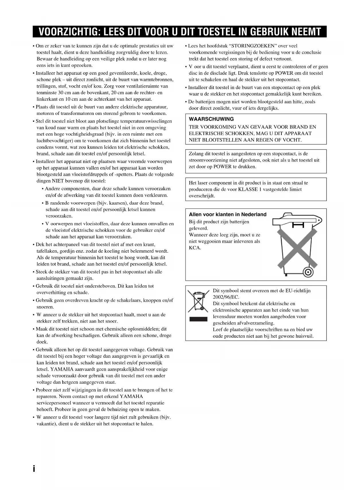 NIET BLOOTSTELLEN AAN REGEN OF VOCHT. Zolang dit toestel is aangesloten op een stopcontact, is de stroomvoorziening niet afgesloten, ook niet als u het toestel uit zet door op POWER te drukken. Het laser component in dit product is in staat een straal te produceren die de voor KLASSE 1 vastgestelde limiet overschrijdt. Allen voor klanten in Nederland Bij dit product zijn batterijen geleverd. Wanneer deze leeg zijn, moet u ze niet weggooien maar inleveren als KCA. Dit symbool stemt overeen met de EU-richtlijn 2002/96/EC. Dit symbool betekent dat elektrische en elektronische apparaten aan het einde van hun levensduur moeten worden aangeboden voor gescheiden afvalverzameling. Leef de plaatselijke voorschriften na en bied uw oude producten niet aan bij het gewone huisvuil.ii CD/CD-R/CD-RW COMPATIBEL MET DIT APPARAAT ■ Discs waarop u kunt opnemen met dit apparaat Controleer dat u alleen cd-r-discs of cd-rw-discs van betrouwbare fabrikanten gebruikt. Cd-r en cd-rw digitale audio discs waarop één van de onderstaande logo’s staat, kunnen in dit apparaat worden gebruikt. ■ Discs waarop u kunt opnemen