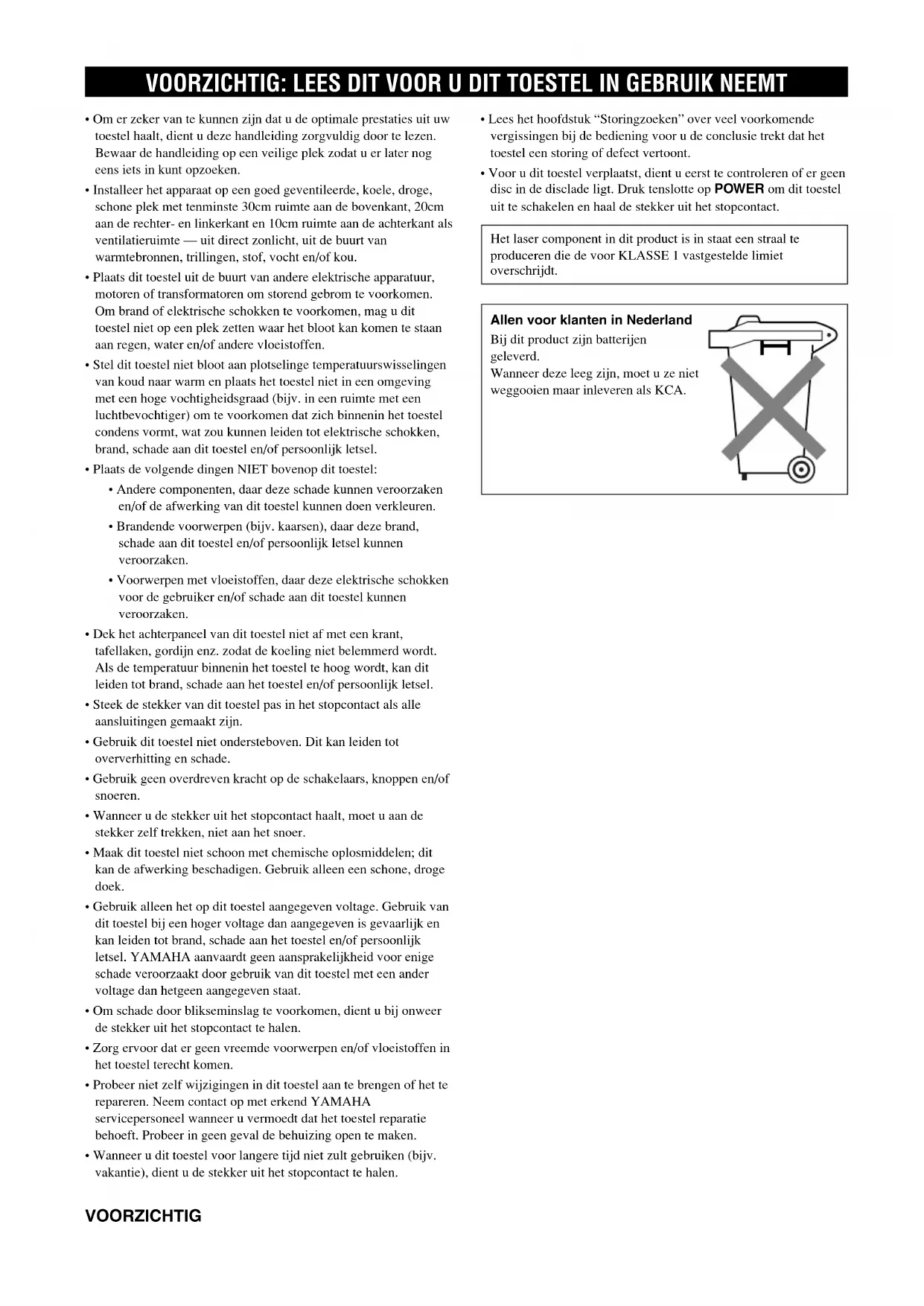 - Gebruik alleen het op dit toestel aangegeven voltage. Gebruik van dit toestel bij een hoger voltage dan aangegeven is gevaarlijk en kan leiden tot brand, schade aan het toestel en/of persoonlijk letsel. YAMAHA aanvaardt geen aansprakelijkheid voor enige schade veroorzaakt door gebruik van dit toestel met een ander voltage dan hetgeen aangegeven staat.
