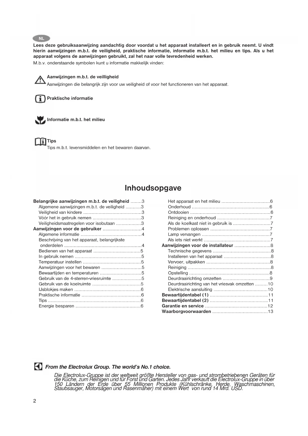 - Waarborgvoorwaarden From the Electrolux Group. The world’s No.1 choice. Die Electrolux-Gruppe ist der weltweit größte Hersteller von gas- und strombetriebenen Geräten für die Küche, zum Reinigen und für Forst und Garten. Jedes Jahr verkauft die Electrolux-Gruppe in über 150 Ländern der Erde über 55 Millionen Produkte (Kühlschränke, Herde, Waschmaschinen, Staubsauger, Motorsägen und Rasenmäher) mit einem Wert von rund 14 Mrd. USD. Lees deze gebruiksaanwijzing aandachtig door voordat u het apparaat installeert en in gebruik neemt. U vindt hierin aanwijzingen m.b.t. de veiligheid, praktische informatie, informatie m.b.t. het milieu en tips. Als u het apparaat volgens de aanwijzingen gebruikt, zal het naar volle tevredenheid werken. M.b.v. onderstaande symbolen kunt u informatie makkelijk vinden: Aanwijzingen m.b.t. de veilligheid Aanwijzingen die belangrijk zijn voor uw veiligheid of voor het functioneren van het apparaat. Praktische informatie Informatie m.b.t. het milieu Tips Tips m.b.t. levensmiddelen en het bewaren daarvan.NL p. 13