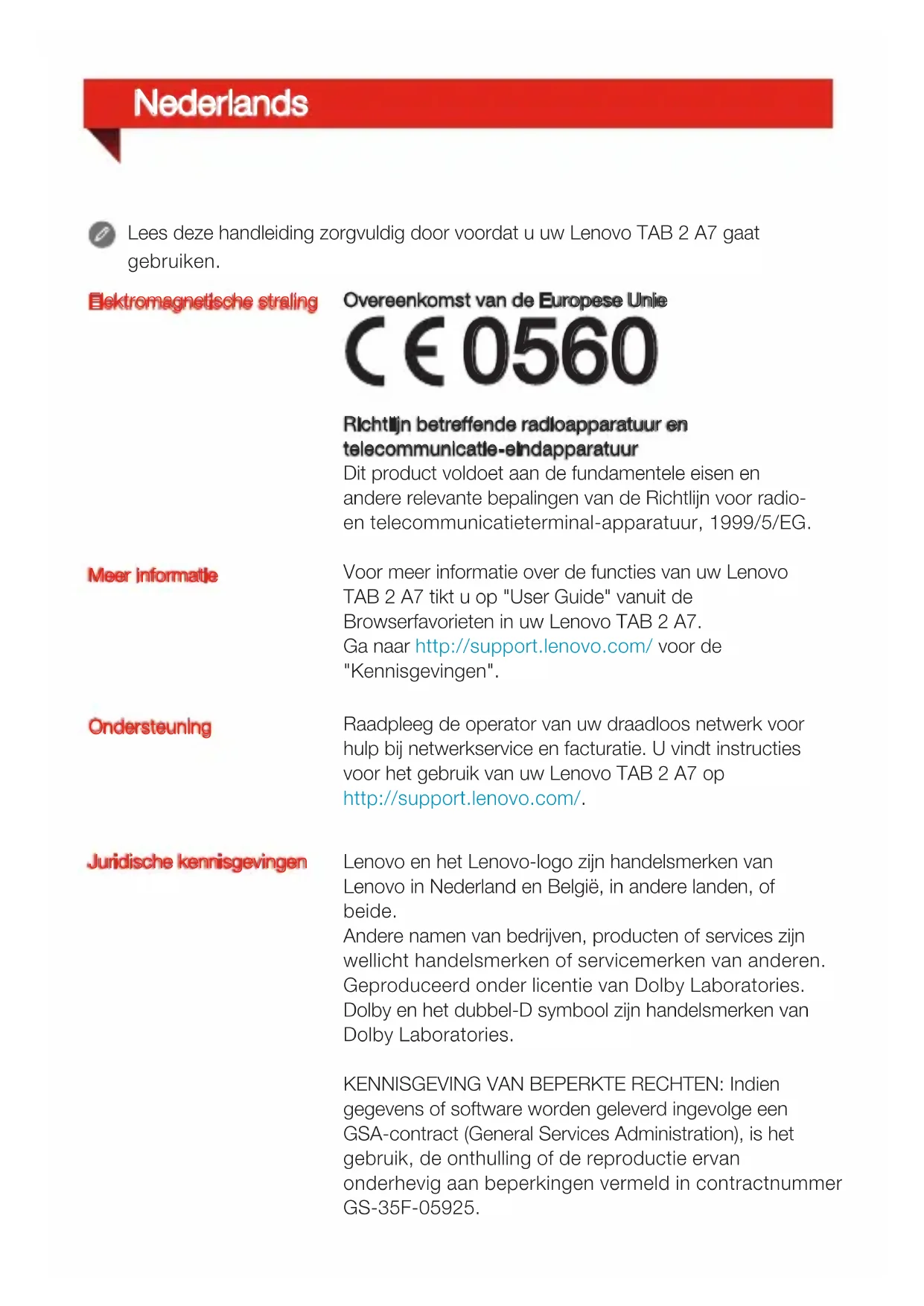 Marcas de reciclagem na bateria Informações sobre a reciclagem da bateria para Taiwan Informações sobre a reciclagem da bateria para os Estados Unidos e o CanadáInformação sobre a reciclagem da bateria para a União Europeia Marca de eficiência energética Marca de Conformidade EurAsia Diretiva de Restrição de Substâncias Perigosas (RoHS) Turco The Lenovo product meets the requirements of the Republic of Turkey Directive on the Restriction of the Use of Certain Hazardous Substances in Electrical and Electronic Equipment (EEE). Ucrânia Índia RoHS compliant as per E-Waste (Management & Handling) Rules, 2011. União Europeia Lenovo products sold in the European Union, on or after 3 January 2013 meet the requirements of Directive 2011/65/EU on the restriction of the use of certain hazardous substances in electrical and electronic equipment (“RoHS recast” or “RoHS 2”). For more information about Lenovo progress on RoHS, go to: http://www.lenovo.com/social_responsibility/us/en/RoHS_Communication.pdf Aviso para utilizadores no México La operación de este equipo está sujeta a las siguientes dos condiciones: (1) es posible que este equipo o dispositivo no cause interferencia perjudicial y (2) este equipo o dispositivo debe aceptar cualquier interferencia, incluyendo la que pueda causar su operación no deseada.Nederlands Elektromagnetische straling Meer informatie Juridische kennisgevingen Lenovo en het Lenovo-logo zijn handelsmerken van Lenovo in Nederland en België, in andere landen, of beide. Andere namen van bedrijven, producten of services zijn wellicht handelsmerken of servicemerken van anderen. Geproduceerd onder licentie van Dolby Laboratories. Dolby en het dubbel-D symbool zijn handelsmerken van Dolby Laboratories. KENNISGEVING VAN BEPERKTE RECHTEN: Indien gegevens of software worden geleverd ingevolge een GSA-contract (General Services Administration), is het gebruik, de onthulling of de reproductie ervan onderhevig aan beperkingen vermeld in contractnummer GS-35F-05925. Voor meer informatie over de functies van uw Lenovo TAB 2 A7 tikt u op "User Guide" vanuit de Browserfavorieten in uw Lenovo TAB 2 A7. Ga naar http://support.lenovo.com/ voor de "Kennisgevingen". Ondersteuning Raadpleeg de operator van uw draadloos netwerk voor hulp bij netwerkservice en facturatie. U vindt instructies voor het gebruik van uw Lenovo TAB 2 A7 op http://support.lenovo.com/. Lees deze handleiding zorgvuldig door voordat u uw Lenovo TAB 2 A7 gaat gebruiken. Richtlijn betreffende radioapparatuur en telecommunicatie-eindapparatuur Dit product voldoet aan de fundamentele eisen en andere relevante bepalingen van de Richtlijn voor radio- en telecommunicatieterminal-apparatuur, 1999/5/EG. Overeenkomst van de Europese Unie 0560Technische specificaties MT8127 3450 mAh Model en versie Camera Batterij Beeldscherm Draadloze communicatie 0,3M (voorkant) +
