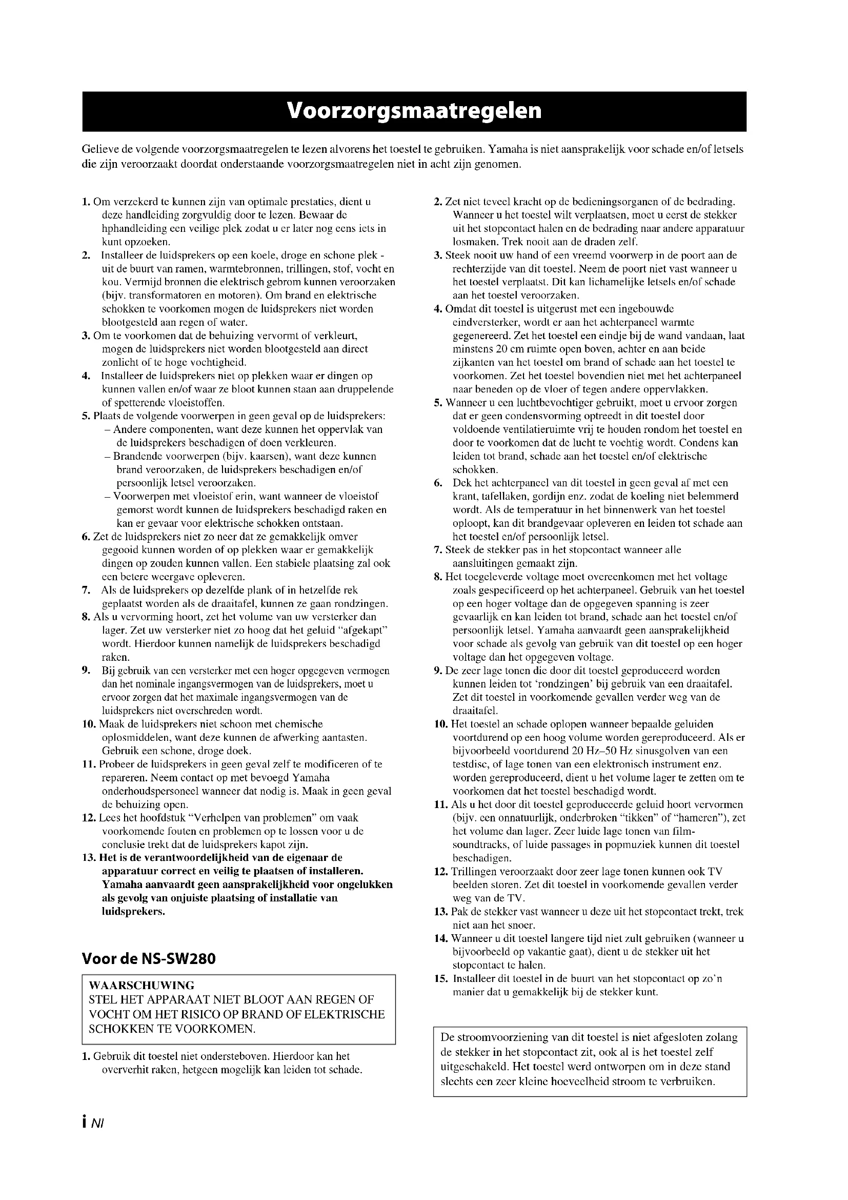 geplaatst worden als de draaitafel, kunnen ze gaan rondzingen.8. Als u vervorming hoort, zet het volume van uw versterker dan lager. Zet uw versterker niet zo hoog dat het geluid “afgekapt” wordt. Hierdoor kunnen namelijk de luidsprekers beschadigd raken. Bij gebruik van een versterker met een hoger opgegeven vermogen dan het nominale ingangsvermogen van de luidsprekers, moet u ervoor zorgen dat het maximale ingangsvermogen van de luidsprekers niet overschreden wordt. 10. Maak de luidsprekers niet schoon met chemische oplosmiddelen, want deze kunnen de afwerking aantasten. Gebruik een schone, droge doek.11. Probeer de luidsprekers in geen geval zelf te modificeren of te repareren. Neem contact op met bevoegd Yamaha onderhoudspersoneel wanneer dat nodig is. Maak in geen geval de behuizing open.12. Lees het hoofdstuk “Verhelpen van problemen” om vaak voorkomende fouten en problemen op te lossen voor u de conclusie trekt dat de luidsprekers kapot zijn.13. Het is de verantwoordelijkheid van de eigenaar de apparatuur correct en veilig te plaatsen of installeren. Yamaha aanvaardt geen aansprakelijkheid voor ongelukken als gevolg van onjuiste plaatsing of installatie van luidsprekers. Voor de NS-SW280 1. Gebruik dit toestel niet ondersteboven. Hierdoor kan het oververhit raken, hetgeen mogelijk kan leiden tot schade.2. Zet niet teveel kracht op de bedieningsorganen of de bedrading. Wanneer u het toestel wilt verplaatsen, moet u eerst de stekker uit het stopcontact halen en de bedrading naar andere apparatuur losmaken. Trek nooit aan de draden zelf. 3. Steek nooit uw hand of een vreemd voorwerp in de poort aan de rechterzijde van dit toestel. Neem de poort niet vast wanneer u het toestel verplaatst. Dit kan lichamelijke letsels en/of schade aan het toestel veroorzaken.4. Omdat dit toestel is uitgerust met een ingebouwde eindversterker, wordt er aan het achterpaneel warmte gegenereerd. Zet het toestel een eindje bij de wand vandaan, laat minstens 20 cm ruimte open boven, achter en aan beide zijkanten van het toestel om brand of schade aan het toestel te voorkomen. Zet het toestel bovendien niet met het achterpaneel naar beneden op de vloer of tegen andere oppervlakken. 5. Wanneer u een luchtbevochtiger gebruikt, moet u ervoor zorgen dat er geen condensvorming optreedt in dit toestel door voldoende ventilatieruimte vrij te houden rondom het toestel en door te voorkomen dat de lucht te vochtig wordt. Condens kan leiden tot brand, schade aan het toestel en/of elektrische schokken.