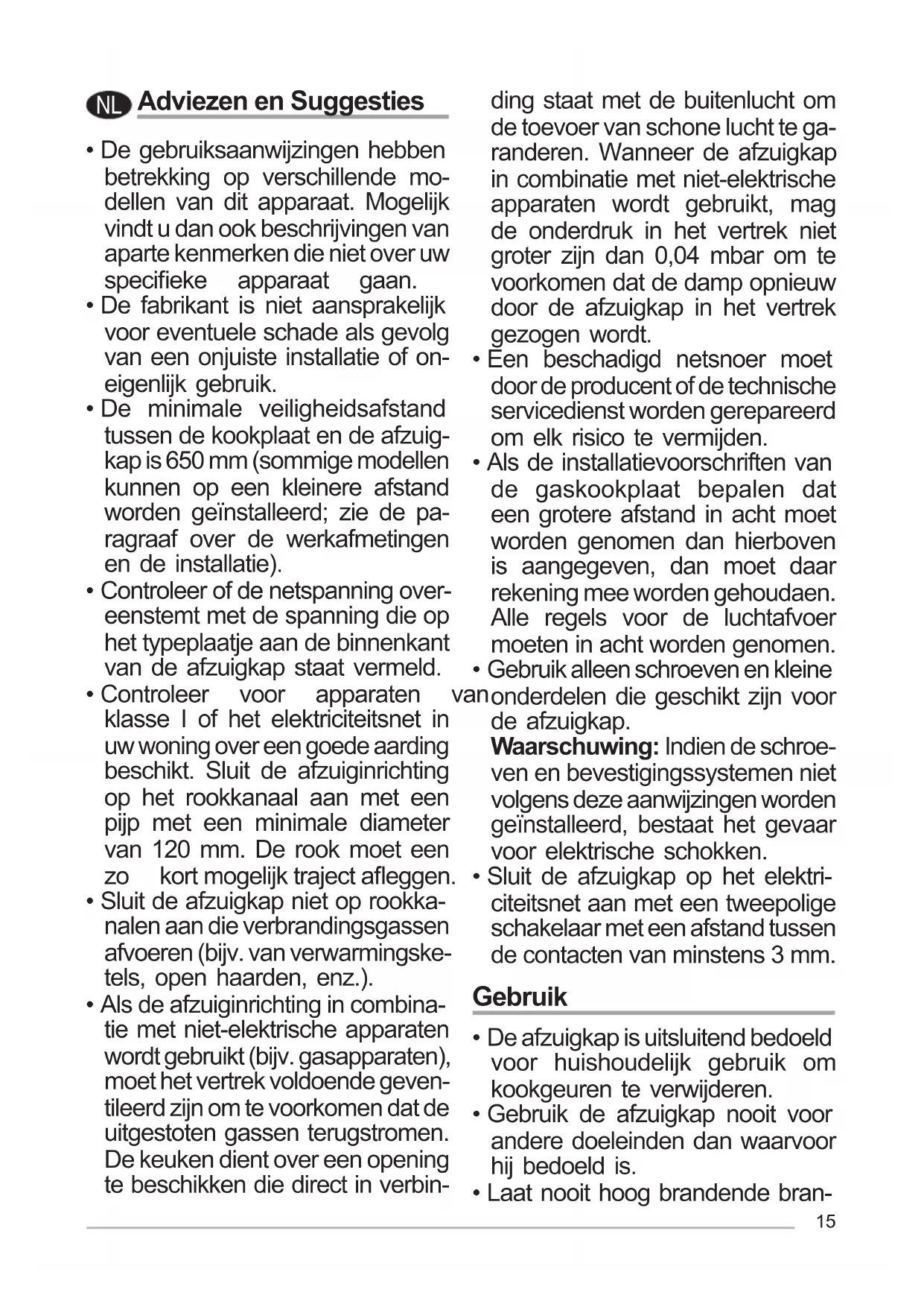 - Gebruik de afzuigkap nooit voor andere doeleinden dan waarvoor hij bedoeld is.