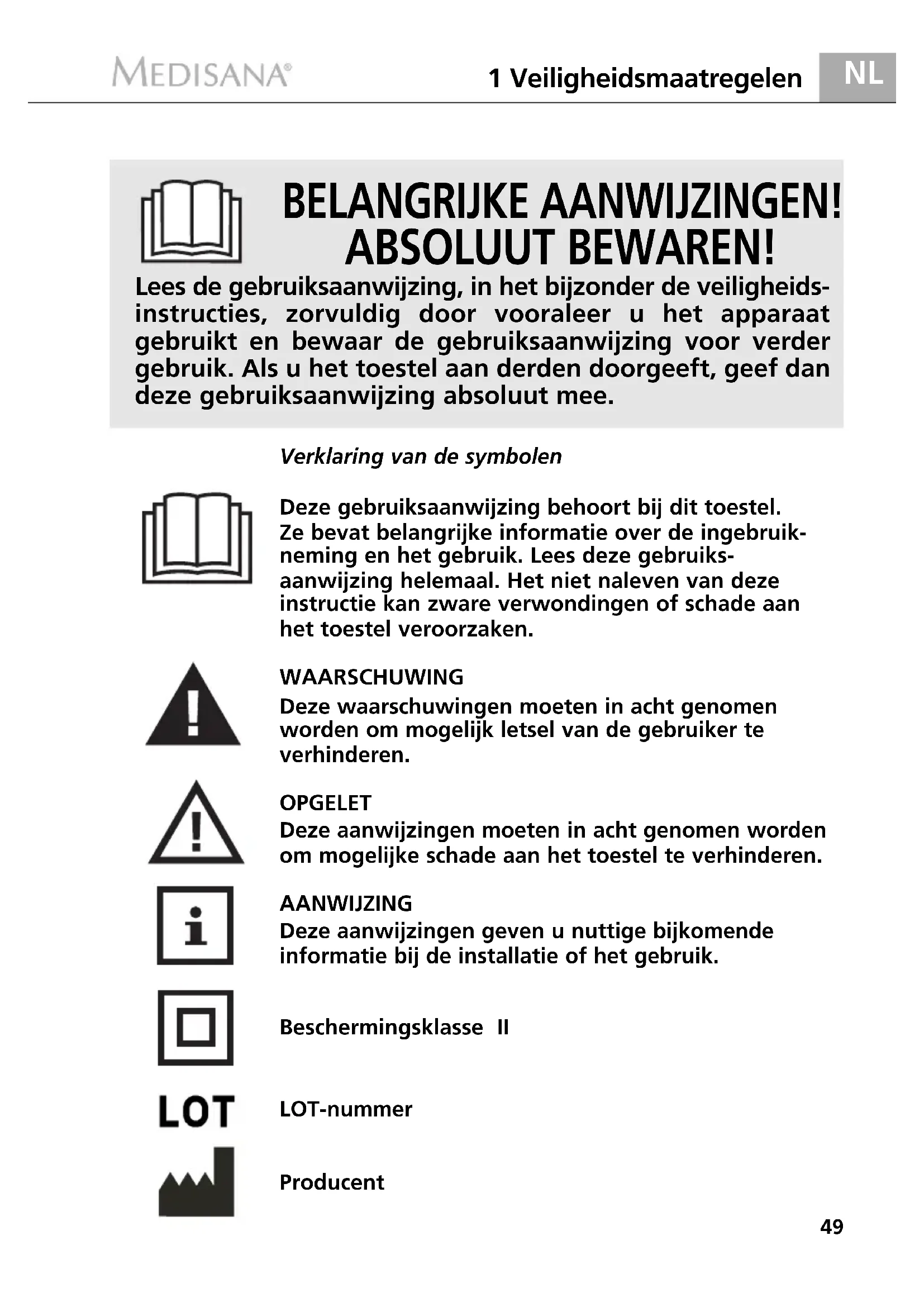 - U mag aan het apparaat enkel reinigingswerkzaamheden uit- voeren. Repareer het apparaat in het geval van storingen niet zelf, omdat hierdoor de garantie vervalt. Vraag uw vakhandel en laat de reparaties alleen door de MEDISANA-Service verrichten.