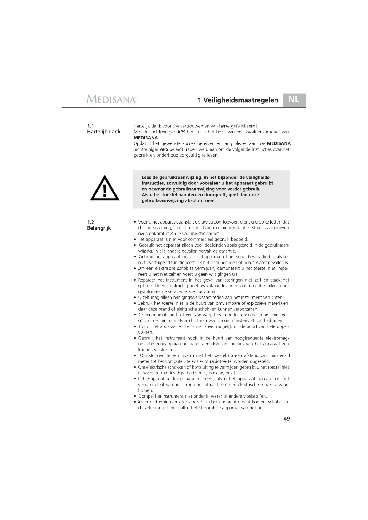 Belangrijk Hartelijk dank voor uw vertrouwen en van harte gefeliciteerd! Met de luchtreiniger APS bent u in het bezit van een kwaliteitsproduct van MEDISANA. Opdat u het gewenste succes bereiken en lang plezier aan uw MEDISANA luchtreiniger APS beleeft, raden we u aan om de volgende instructies over het gebruik en onderhoud zorgvuldig te lezen. Lees de gebruiksaanwijzing, in het bijzonder de veiligheids- instructies, zorvuldig door vooraleer u het apparaat gebruikt en bewaar de gebruiksaanwijzing voor verder gebruik. Als u het toestel aan derden doorgeeft, geef dan deze gebruiksaanwijzing absoluut mee.