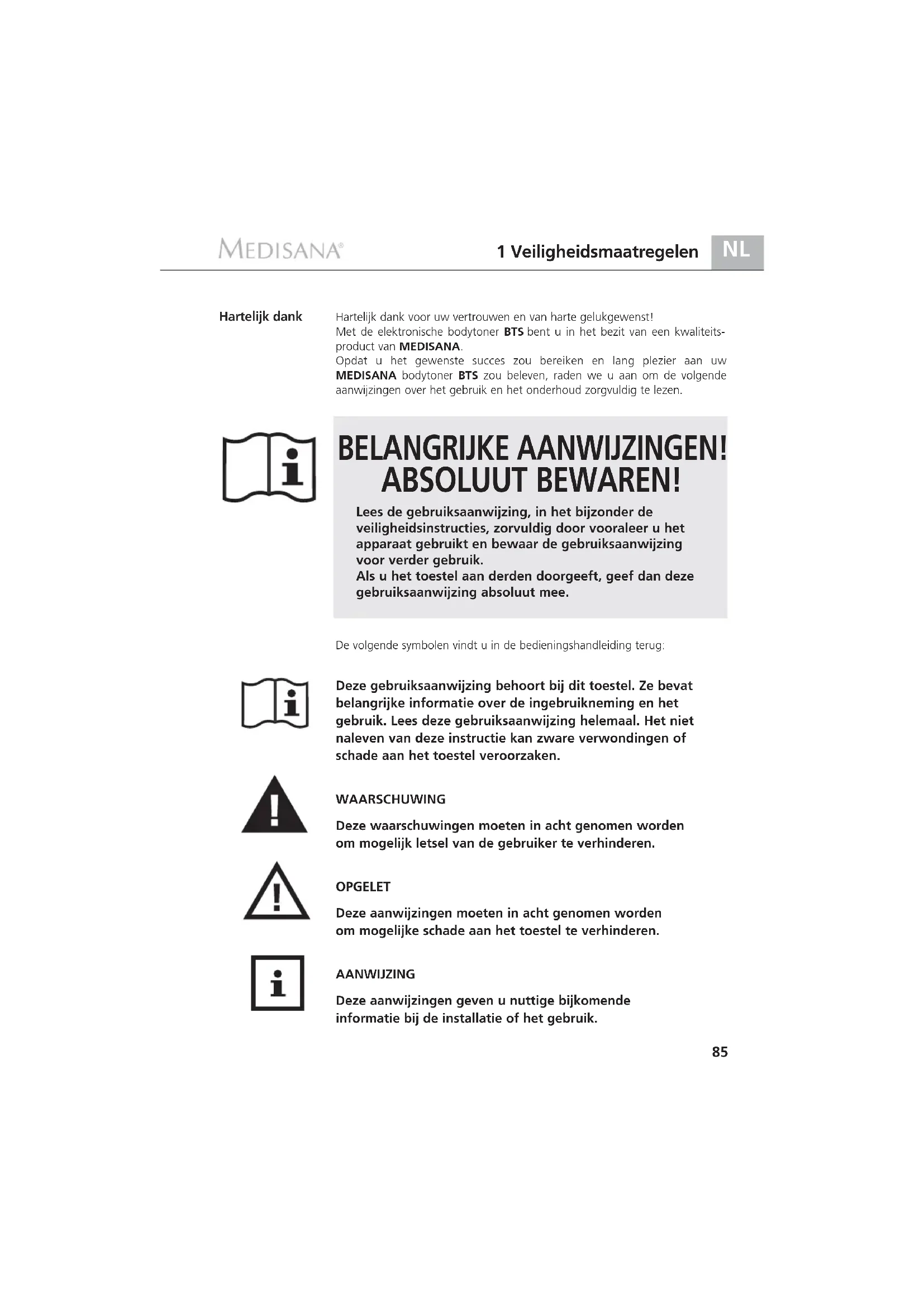 Opdat u het gewenste succes zou bereiken en lang plezier aan uw MEDISANA bodytoner BTS zou beleven, raden we u aan om de volgende aanwijzingen over het gebruik en het onderhoud zorgvuldig te lezen.
