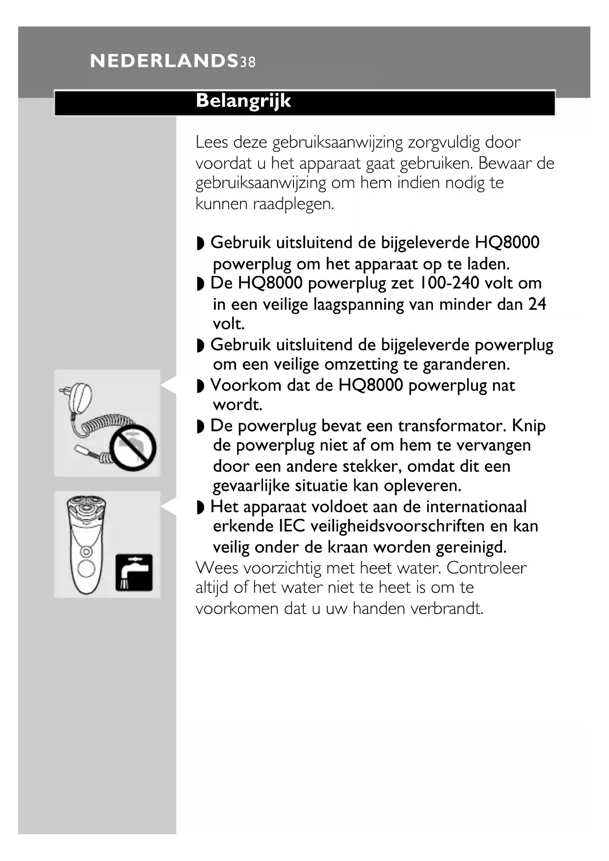 Cause: les accumulateurs sont vides. ◗ Rechargez le rasoir. FRANÇAIS 37Belangrijk Lees deze gebruiksaanwijzing zorgvuldig door voordat u het apparaat gaat gebruiken. Bewaar de gebruiksaanwijzing om hem indien nodig te kunnen raadplegen. ◗ Gebruik uitsluitend de bijgeleverde HQ8000 powerplug om het apparaat op te laden. ◗ De HQ8000 powerplug zet 100-240 volt om in een veilige laagspanning van minder dan 24 volt. ◗ Gebruik uitsluitend de bijgeleverde powerplug om een veilige omzetting te garanderen.