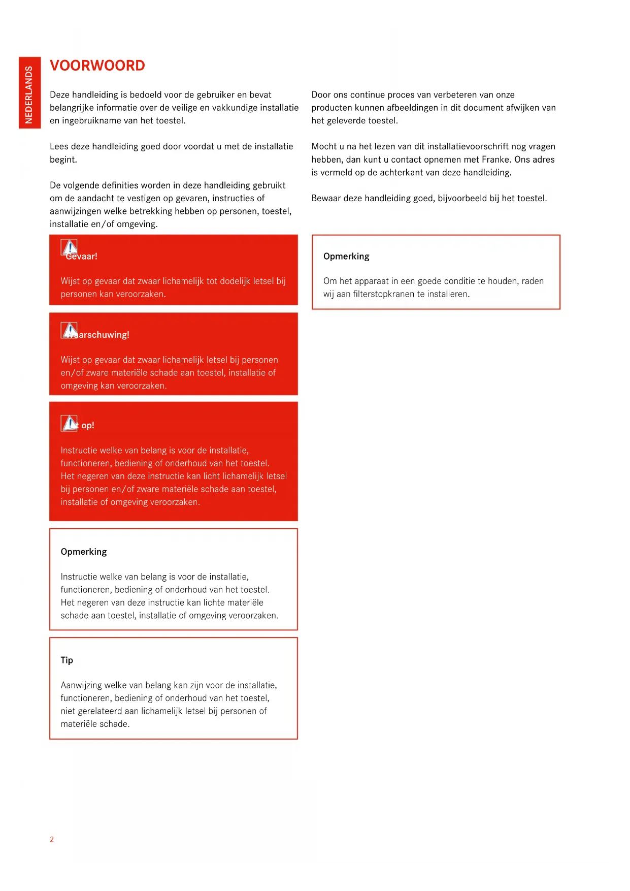 Mocht u na het lezen van dit installatievoorschrift nog vragen hebben, dan kunt u contact opnemen met Franke. Ons adres is vermeld op de achterkant van deze handleiding.