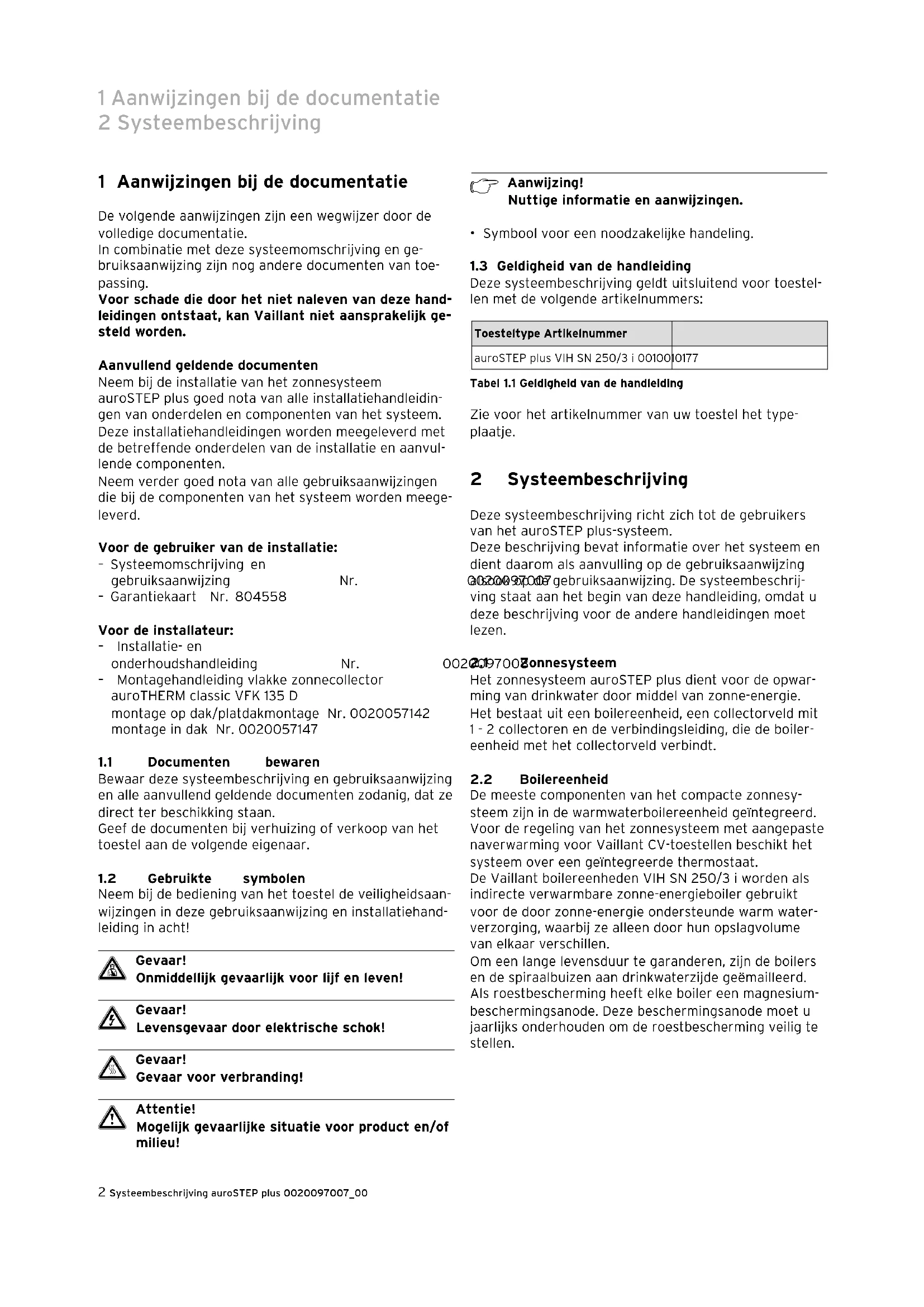 Deze systeembeschrijving geldt uitsluitend voor toestel- len met de volgende artikelnummers: Toesteltype Artikelnummer auroSTEP plus VIH SN 250/3 i 0010010177 Tabel 1.1 Geldigheid van de handleiding Zie voor het artikelnummer van uw toestel het type- plaatje. 2 Systeembeschrijving Deze systeembeschrijving richt zich tot de gebruikers van het auroSTEP plus-systeem. Deze beschrijving bevat informatie over het systeem en dient daarom als aanvulling op de gebruiksaanwijzing alsook op de gebruiksaanwijzing. De systeembeschrij- ving staat aan het begin van deze handleiding, omdat u deze beschrijving voor de andere handleidingen moet lezen.