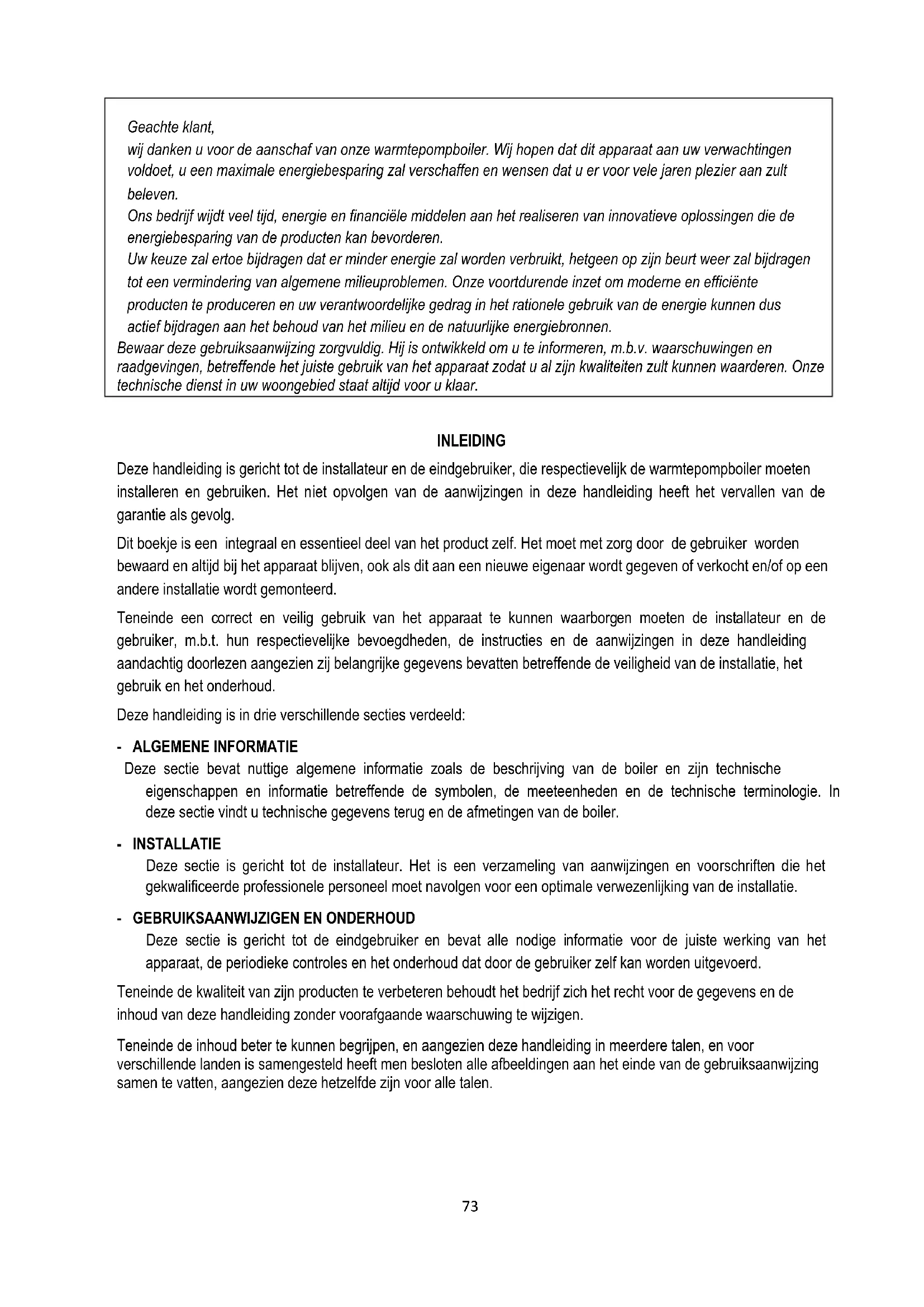 INLEIDING Deze handleiding is gericht tot de installateur en de eindgebruiker, die respectievelijk de warmtepompboiler moeten installeren en gebruiken. Het niet opvolgen van de aanwijzingen in deze handleiding heeft het vervallen van de garantie als gevolg. Dit boekje is een integraal en essentieel deel van het product zelf. Het moet met zorg door de gebruiker worden bewaard en altijd bij het apparaat blijven, ook als dit aan een nieuwe eigenaar wordt gegeven of verkocht en/of op een andere installatie wordt gemonteerd. Teneinde een correct en veilig gebruik van het apparaat te kunnen waarborgen moeten de installateur en de gebruiker, m.b.t. hun respectievelijke bevoegdheden, de instructies en de aanwijzingen in deze handleiding aandachtig doorlezen aangezien zij belangrijke gegevens bevatten betreffende de veiligheid van de installatie, het gebruik en het onderhoud. Deze handleiding is in drie verschillende secties verdeeld: - ALGEMENE INFORMATIE Deze sectie bevat nuttige algemene informatie zoals de beschrijving van de boiler en zijn technische eigenschappen en informatie betreffende de symbolen, de meeteenheden en de technische terminologie. In deze sectie vindt u technische gegevens terug en de afmetingen van de boiler. - INSTALLATIE Deze sectie is gericht tot de installateur. Het is een verzameling van aanwijzingen en voorschriften die het gekwalificeerde professionele personeel moet navolgen voor een optimale verwezenlijking van de installatie.