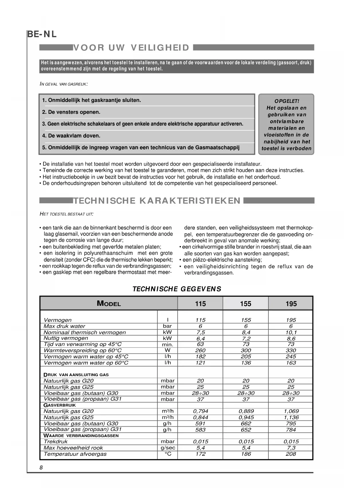 - een tank die aan de binnenkant beschermd is door eenlaag glasemail, voorzien van een beschermende anodetegen de corrosie van lange duur;• een buitenbekleding met geverfde metalen platen;• een isolering in polyurethaanschuim met een grotedensiteit (zonder CFC) die de thermische lekken beperkt;• een rookkap tegen de reflux van de verbrandingsgassen;• een gasklep met een regelbare thermostaat met meer- TECHNISCHE KARAKTERISTIEKEN TECHNISCHE GEGEVENS 1. Onmiddellijk het gaskraantje sluiten.2. De vensters openen.3. Geen elektrische schakelaars of geen enkele andere elektrische apparatuur activeren.4. De waakvlam doven.5. Onmiddellijk de ingreep vragen van een technicus van de GasmaatschappijOPGELET!Het opslaan engebruiken vanontvlambarematerialen envloeistoffen in denabijheid van hettoestel is verbodenVermogenMax druk waterNominaal thermisch vermogenNuttig vermogenTijd van verwarming op 45°CWarmteverspreiding op 60°CVermogen warm water op 45°CVermogen warm water op 60°C