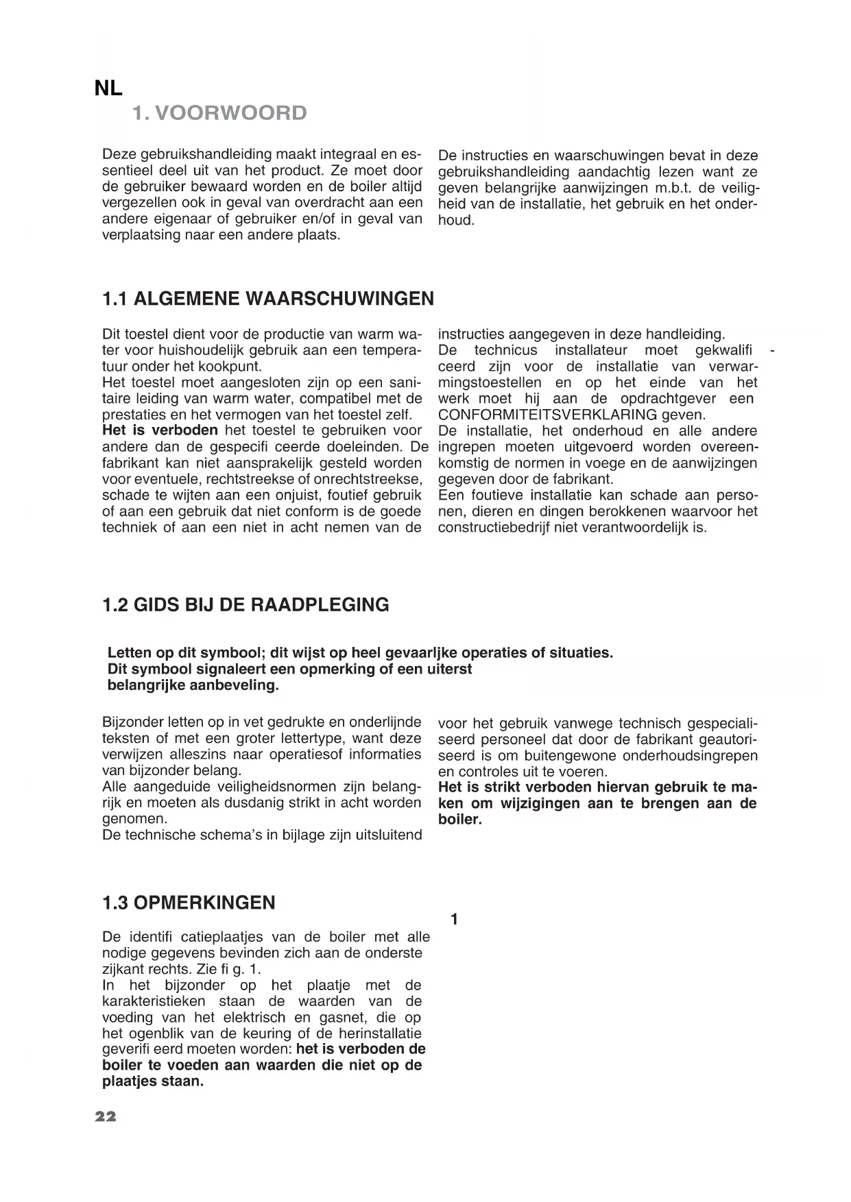 Letten op dit symbool; dit wijst op heel gevaarljke operaties of situaties. Dit symbool signaleert een opmerking of een uiterst belangrijke aanbeveling. Bijzonder letten op in vet gedrukte en onderlijnde teksten of met een groter lettertype, want deze verwijzen alleszins naar operatiesof informaties van bijzonder belang. Alle aangeduide veiligheidsnormen zijn belang- rijk en moeten als dusdanig strikt in acht worden genomen. De technische schema’s in bijlage zijn uitsluitend voor het gebruik vanwege technisch gespeciali- seerd personeel dat door de fabrikant geautori- seerd is om buitengewone onderhoudsingrepen en controles uit te voeren. Het is strikt verboden hiervan gebruik te ma- ken om wijzigingen aan te brengen aan de boiler.