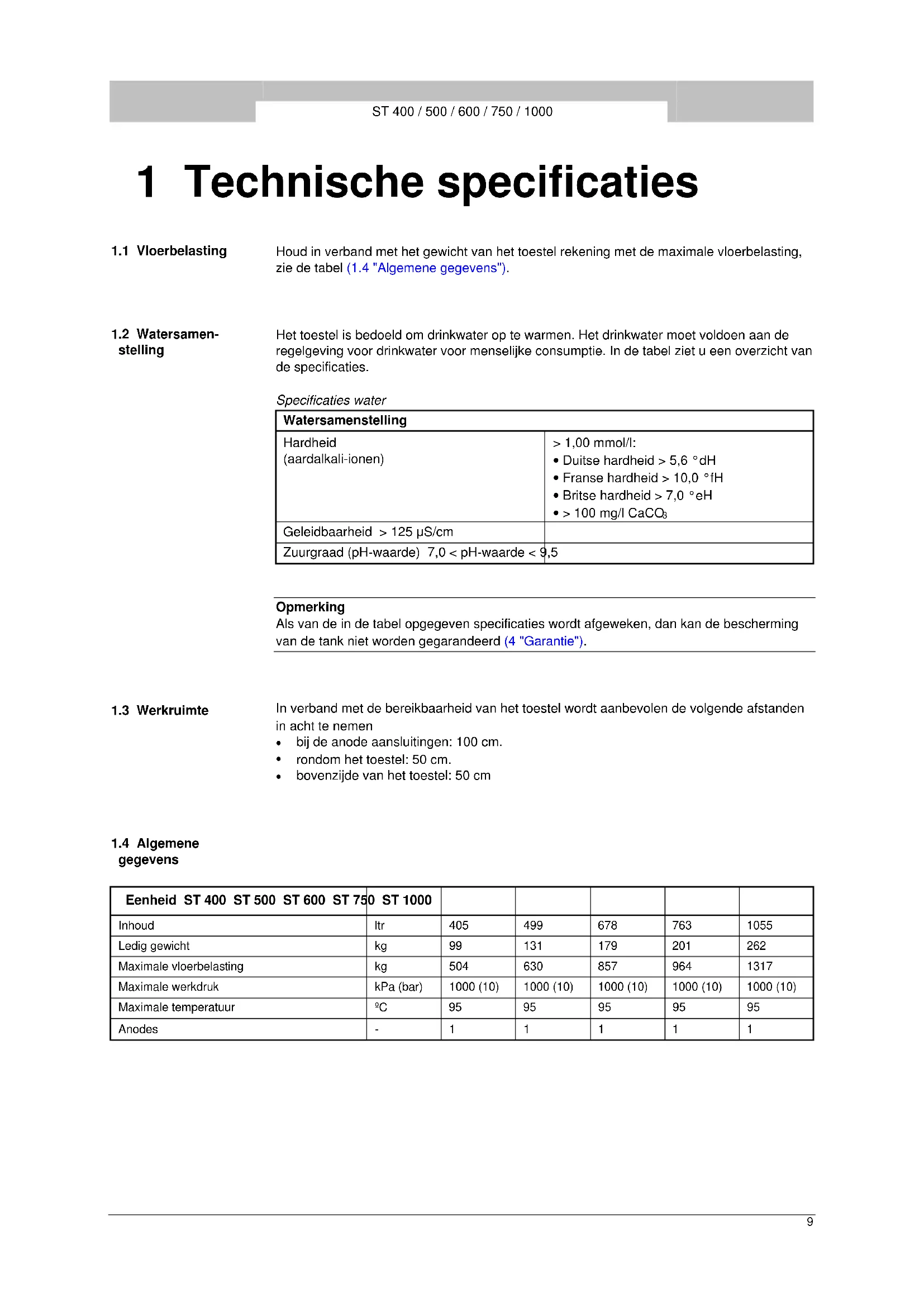 Ontkalken en reinigen tank Ketelsteen- en kalkaanslag verhinderen een goede geleiding van de warmte naar het water. Periodiek reinigen en ontkalken voorkomt vorming van deze aanslag. Hierdoor wordt de levensduur van het toestel verlengd en bovendien het verwarmingsproces bevorderd. Bij bepaling van de onderhoudsfrequentie dient rekening gehouden te worden met de snelheid van de kalkvorming. Kalkvorming is afhankelijk van de plaatselijke watergesteldheid, het waterverbruik en de ingestelde watertemperatuur. Om overmatige kalkaanslag te voorkomen wordt een temperatuurinstelling van maximaal 60°C aanbevolen. Om een goede en waterdichte afsluiting van een reinigingsopening te waarborgen moeten de pakking, sluitringen, bouten en eventueel de deksel na opening vernieuwd worden. Bij de leverancier/fabrikant zijn hiervoor reserve-onderdelen voor te verkrijgen. Voor het eenvoudig ontkalken en reinigen van de tank is het voorraadvat uitgerust met een reinigingsopening.ST 400 / 500 / 600 / 750 / 1000