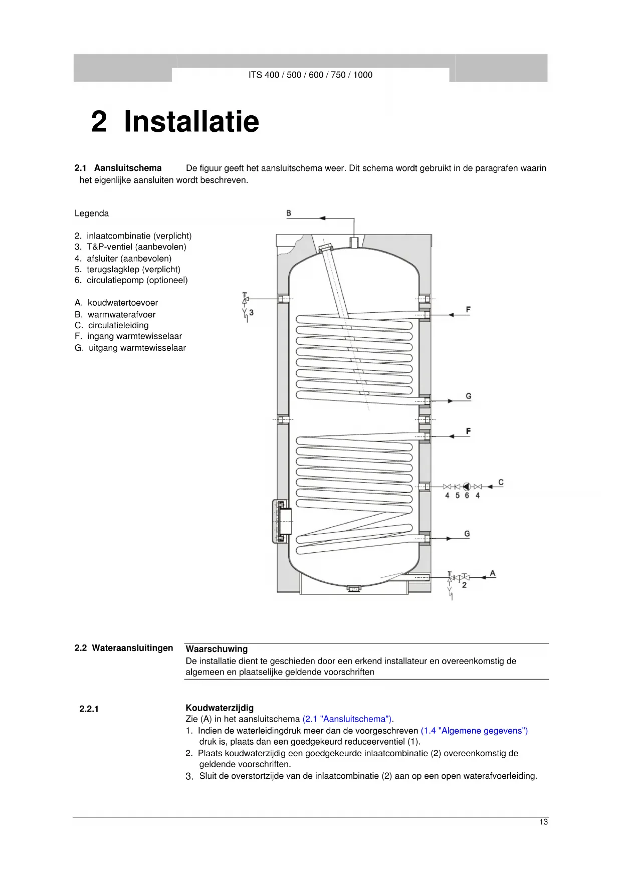 Circulatieleiding Zie (C) in het aansluitschema (2.1 "Aansluitschema"). Indien men direct warm water ter beschikking wil hebben bij tappunten kan een circulatiepomp geïnstalleerd worden. Dit verhoogt het comfort en voorkomt waterverspilling.