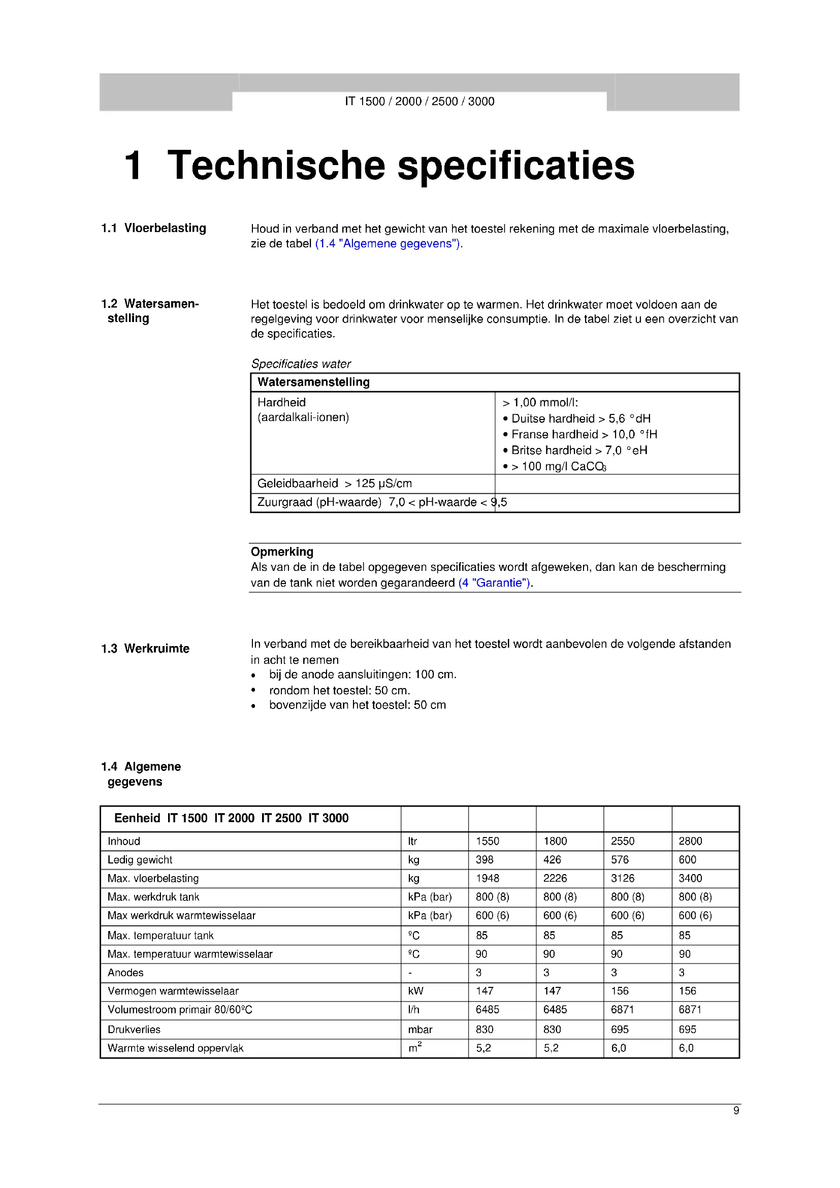 Het toestel is bedoeld om drinkwater op te warmen. Het drinkwater moet voldoen aan de regelgeving voor drinkwater voor menselijke consumptie. In de tabel ziet u een overzicht van de specificaties. Specificaties water Watersamenstelling Hardheid (aardalkali-ionen) > 1,00 mmol/l: