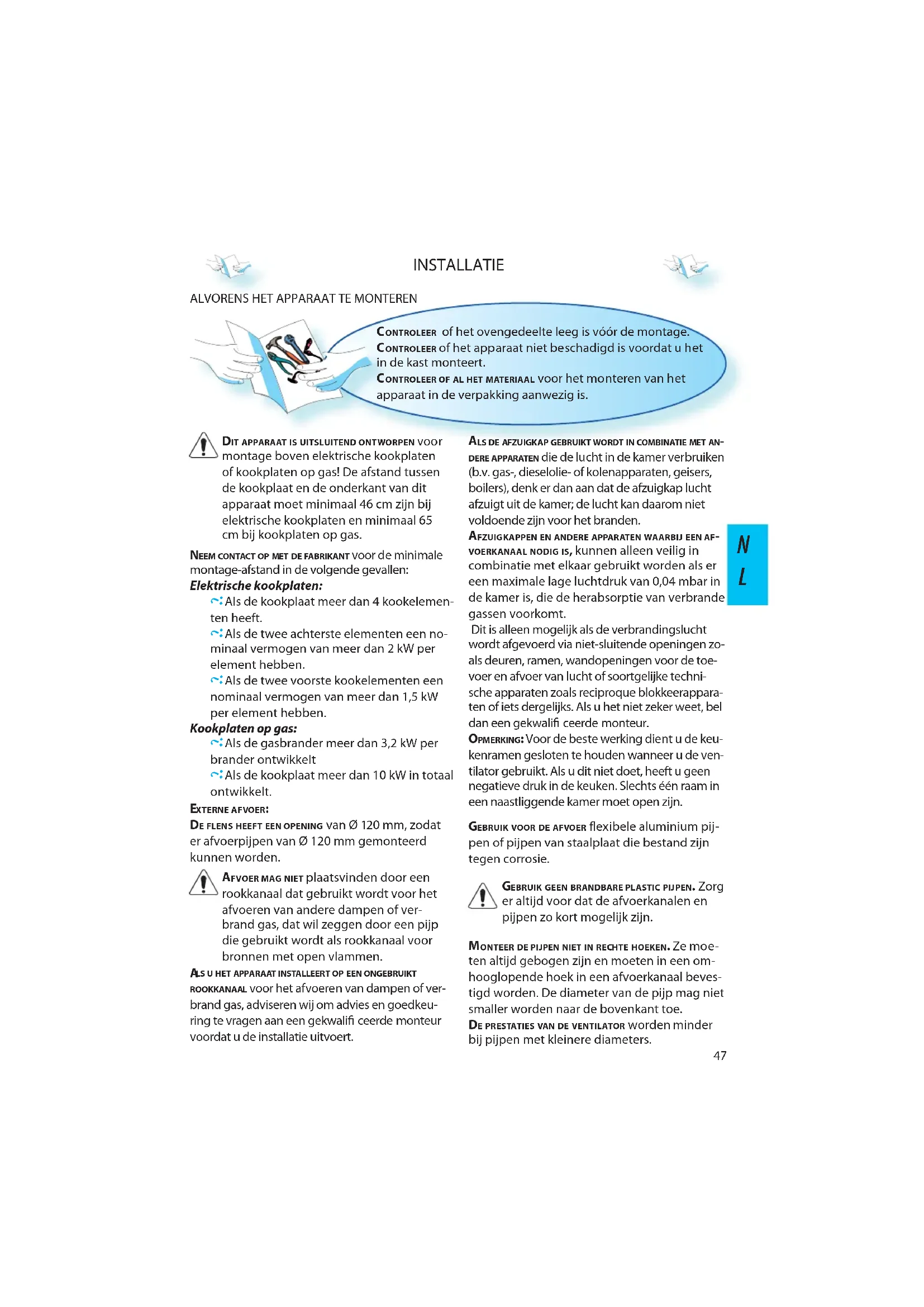FZUIGKAPPEN EN ANDERE APPARATEN WAARBIJ EEN AF- DIT APPARAAT IS UITSLUITEND ONTWORPEN voor montage boven elektrische kookplaten of kookplaten op gas! De afstand tussen de kookplaat en de onderkant van dit apparaat moet minimaal 46 cm zijn bij elektrische kookplaten en minimaal 65 cm bij kookplaten op gas.