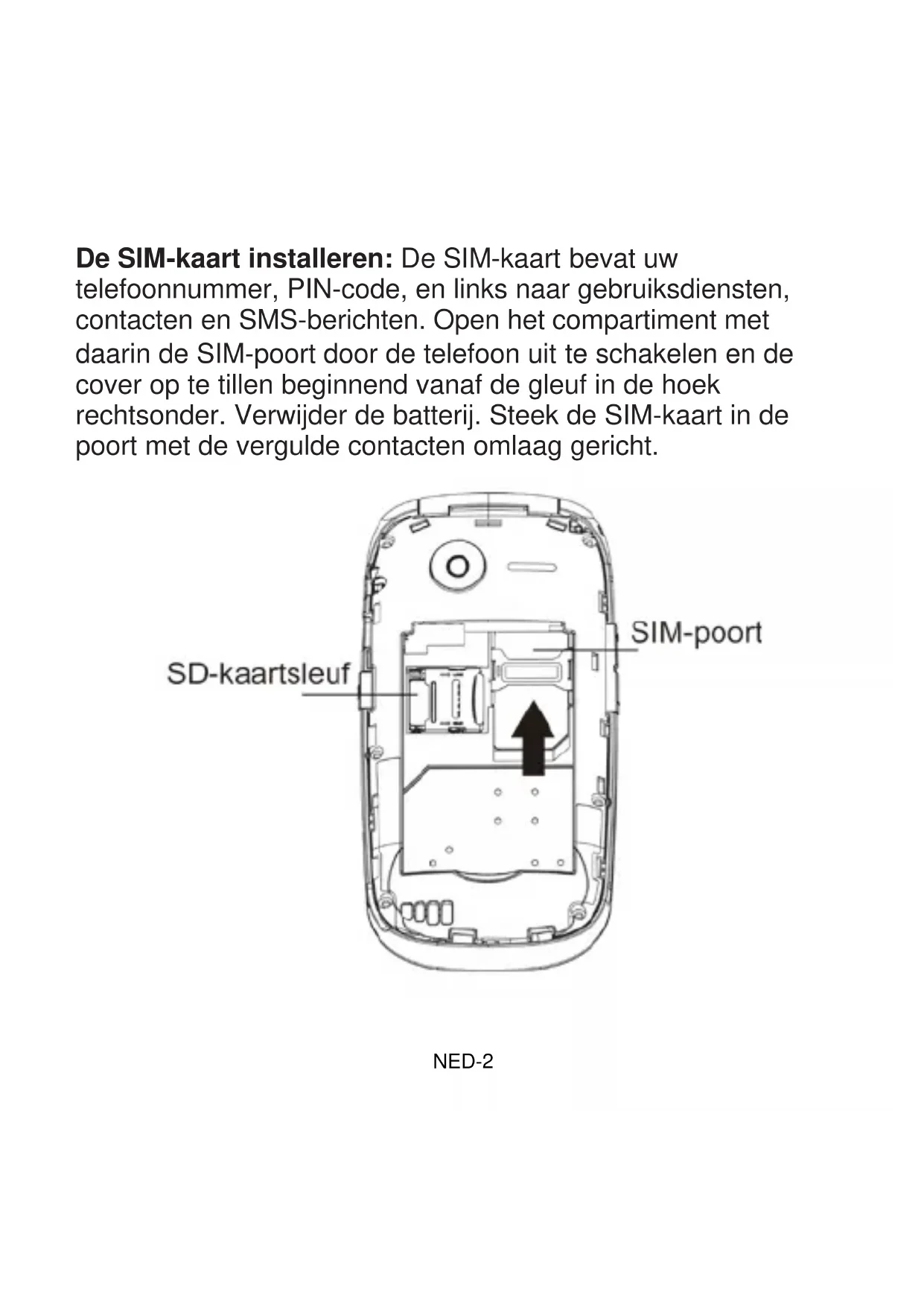 Senior Phone GSP-130 www.facebook.com/denverelectronics Gebruikshandleiding DutchNED-2 De SIM-kaart installeren: De SIM-kaart bevat uw telefoonnummer, PIN-code, en links naar gebruiksdiensten, contacten en SMS-berichten. Open het compartiment met daarin de SIM-poort door de telefoon uit te schakelen en de cover op te tillen beginnend vanaf de gleuf in de hoek rechtsonder. Verwijder de batterij. Steek de SIM-kaart in de poort met de vergulde contacten omlaag gericht.NED-3 Een geheugenkaart installeren: Om de mediaspeler- en camerafuncties te kunnen gebruiken, moet er een MicroSD-geheugenkaart worden geïnstalleerd (niet inbegrepen in de leveringsomvang): deze kaart moet in de achterzijde van de telefoon worden geplaatst, links van de SIM-poort. Installeer de MicroSD-kaart volgens de afbeelding, met de vergulde contacten omlaag gericht: open het metalen palletje door deze richting “open” te drukken, installeer de kaart en sluit het palletje weer door deze in de tegenovergestelde richting (“close”) te drukken. AAN/UIT schakelen en toetsvergrendeling: Houd de rode ophangtoets ingedrukt om de telefoon in en uit te schakelen. Het toetsenpaneel wordt vergrendeld door de telefoon dicht te klappen. Aansluiting op een PC: Gebruik de USB-kabel om de GSP-130 op een computer aan te sluiten. Selecteer U Disk op uw telefoon. U kunt tracks opslaan om af te spelen met de muziekspeler in de folder "Mijn Muziek" op de SD-kaart. De Batterijen Installeren: Uw apparaat is voorzien van een lithium-ionbatterij en is ontworpen om uitsluitend te worden gebruikt met originele batterijen en laders. De batterij moet worden geïnstalleerd in de achterzijde van de telefoon. PlaatsNED-4 de batterij in de batterijhouder met de contacten omhoog gericht richting de contacten van de telefoon. Plaats hierna de achterafdekking terug op zijn plek zoals afgebeeld in de volgende illustraties.